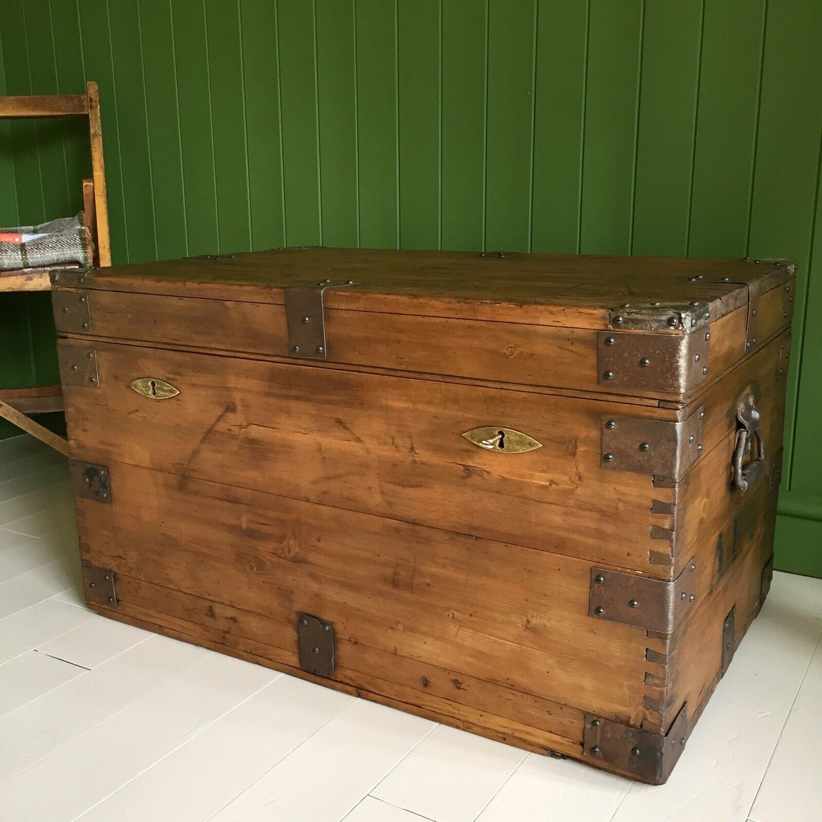 Sold - Antique Campaign Chest Victorian Wooden Military Trunk + Zinc Lining + Key