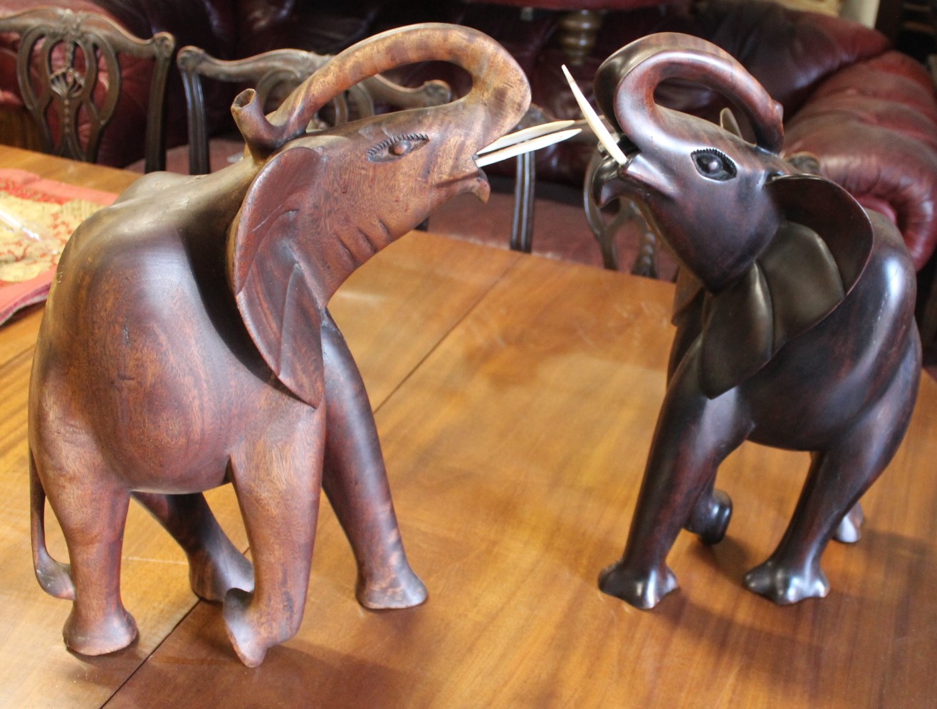 Solid Mahogany Pair of Elephants Carved Statues c.1910