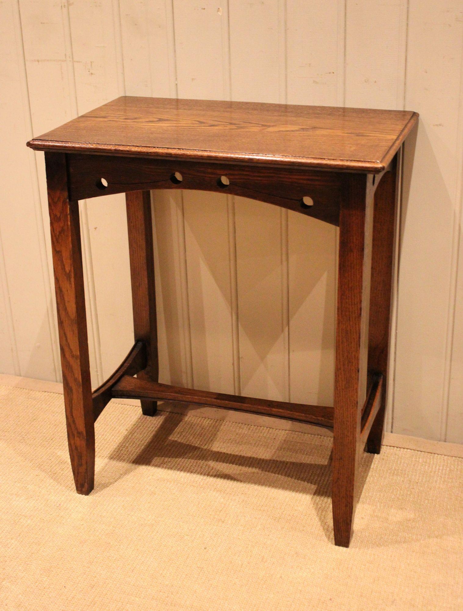 Solid oak Arts & Crafts side table having a pierced apron , raised on straight tapering legs united by a stretcher . * Height72.5 cm / 28 " * Width61 cm / 24 " * Depth39.5 cm / 15 " Please note that not all items are on display in our showrooms and may be in our off-site store. If you wish to see specific items please notify us before visiting so that we can ensure the item(s) are available to view.