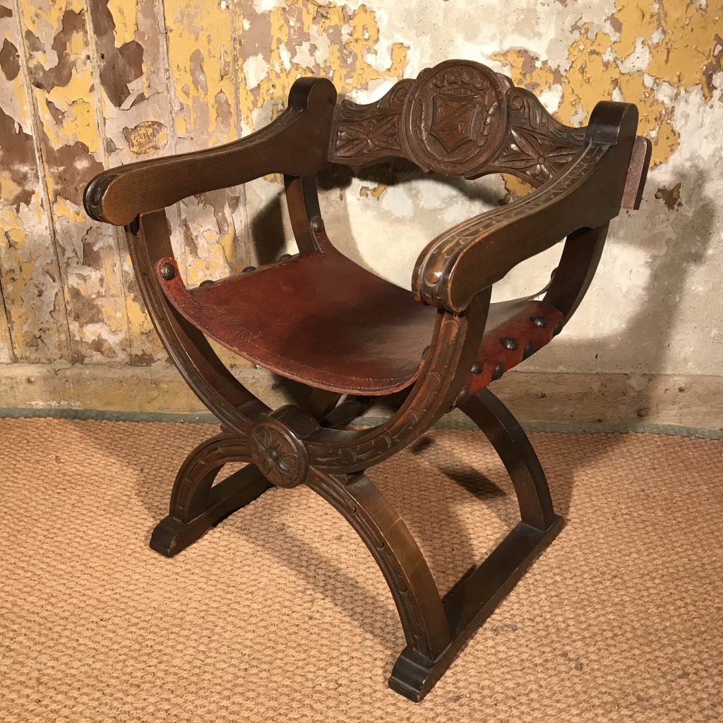 Solid Oak & Leather X Frame Armchair c.1920 (1 of 1)