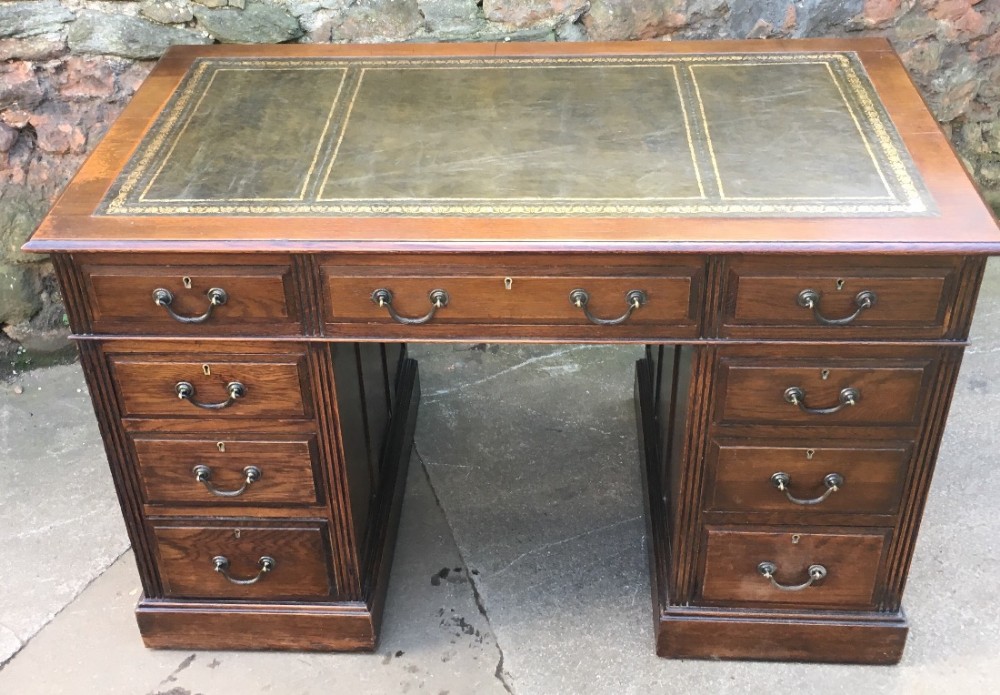 Solid Oak Pedestal Desk with Green Tooled Leather Insert c.1920