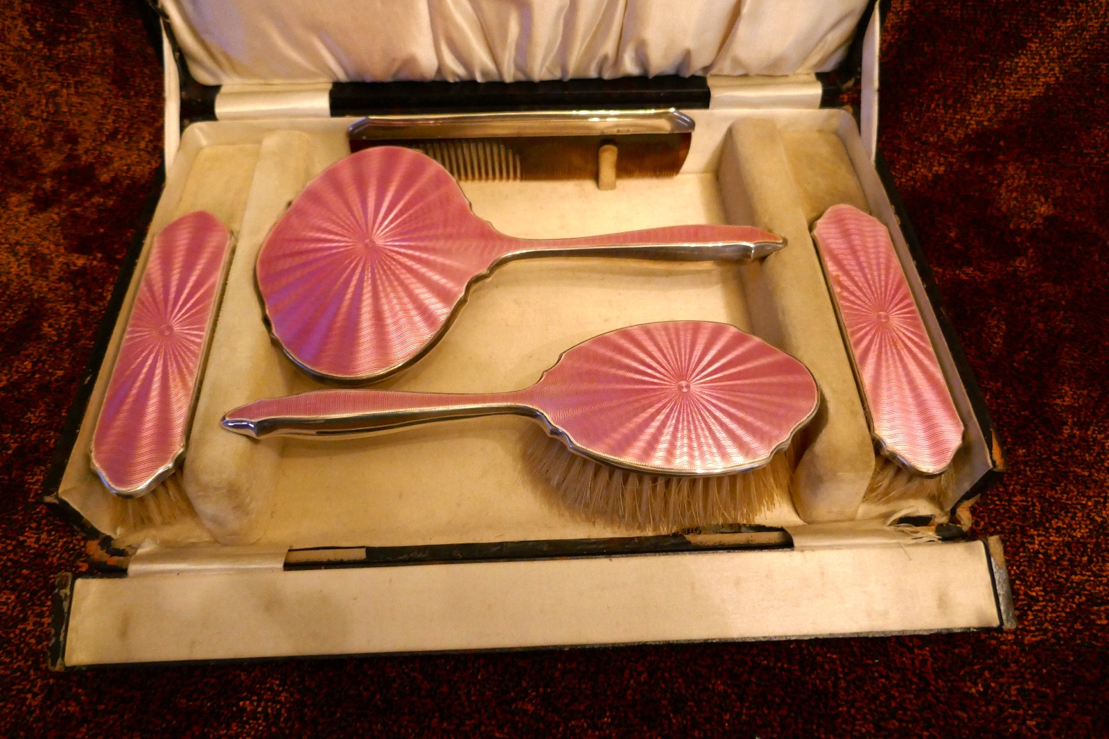 Solid Silver & Guilloché Dressing Table Vanity Set, Original Box