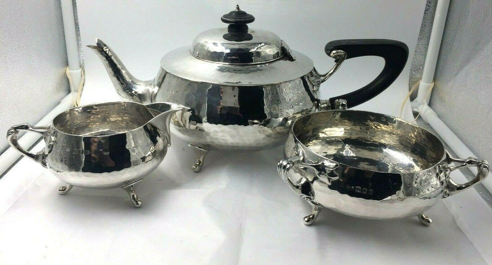 Solid Silver tea set service planished design art nouveau Charles Edwards 1919
