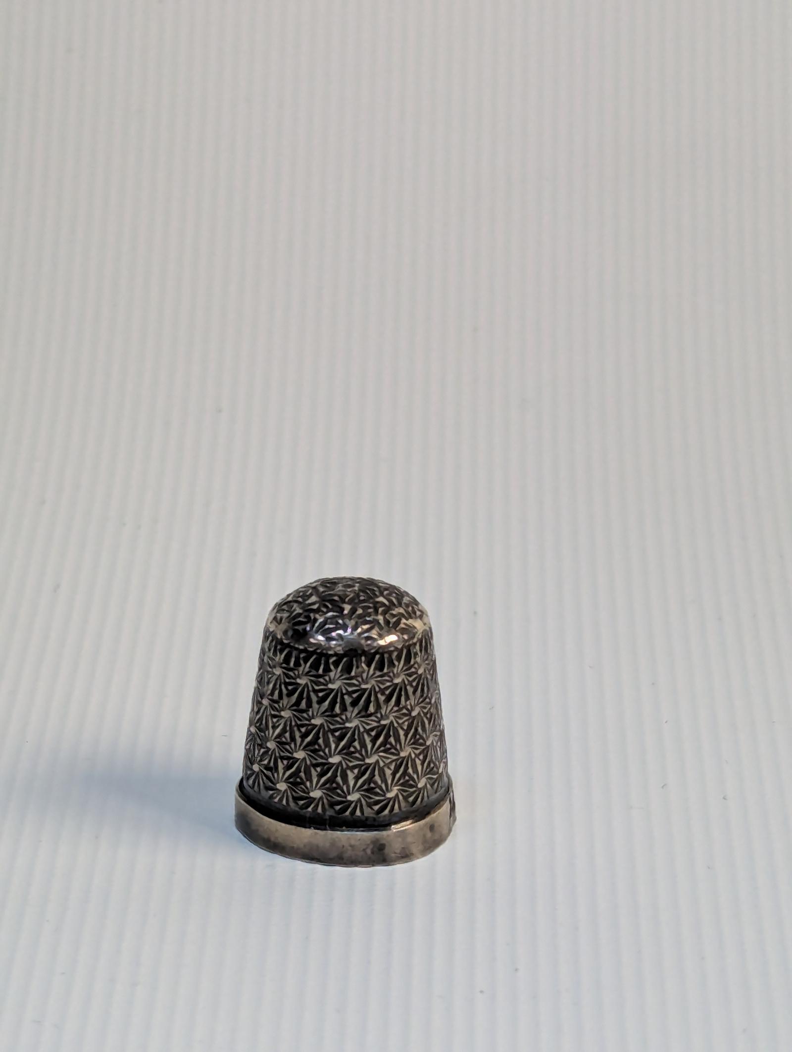 This item is a solid silver thimble, dating to the antique period. It is constructed from sterling silver, featuring a traditional design with a textured surface for grip. The thimble is marked Sterling Silver, which is common for items of this age.
