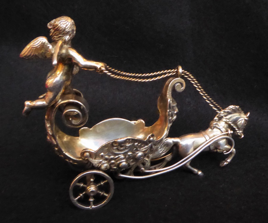 Solid Silver Victorian Salt in the form of a Chariot Driven by a Horse & Winged Putti. 1890 London