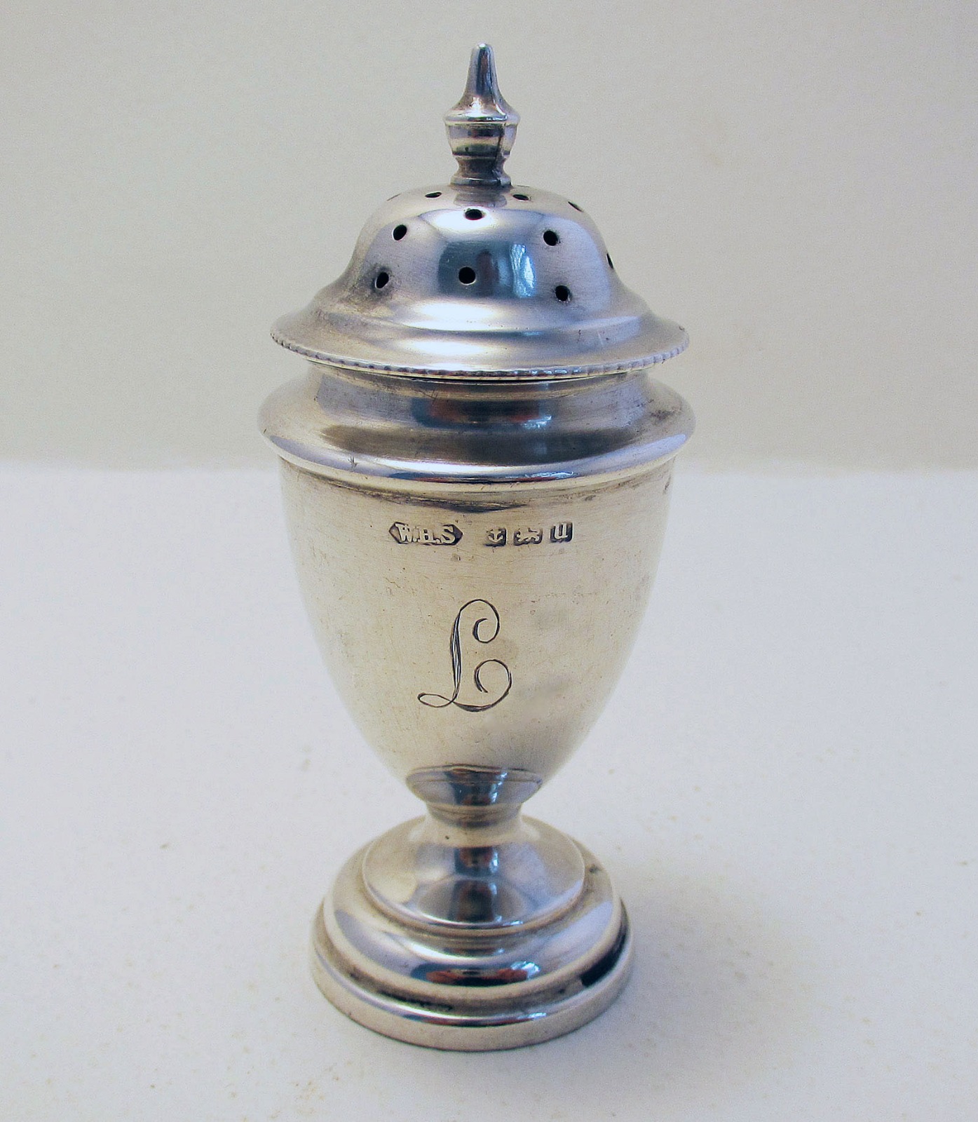 Solid Sterling Silver Pepper Pot Jar Bottle Shaker Caster Pepperette in Georgian Design. English Birmingham Hallmarks. Monogram 'L' 1919