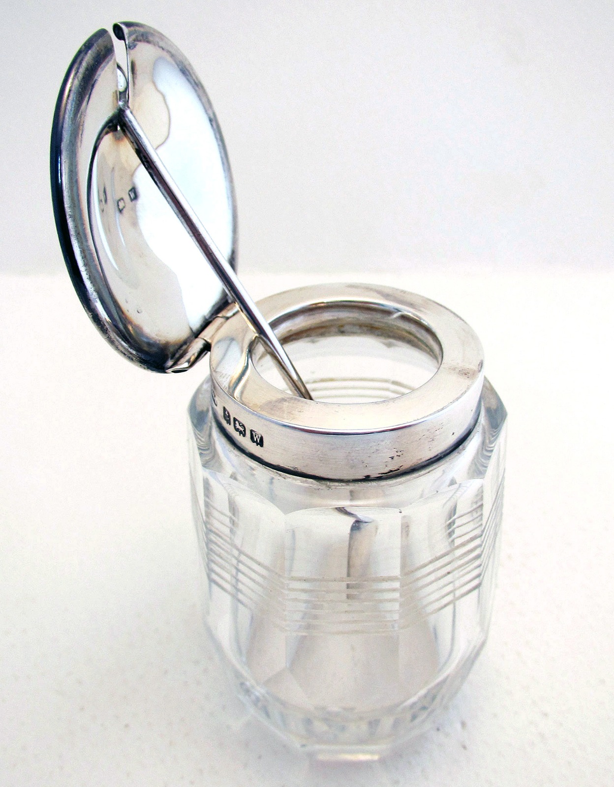 Solid Sterling Silver Top Lidded & Cut Glass Mustard Condiment Pot 1921