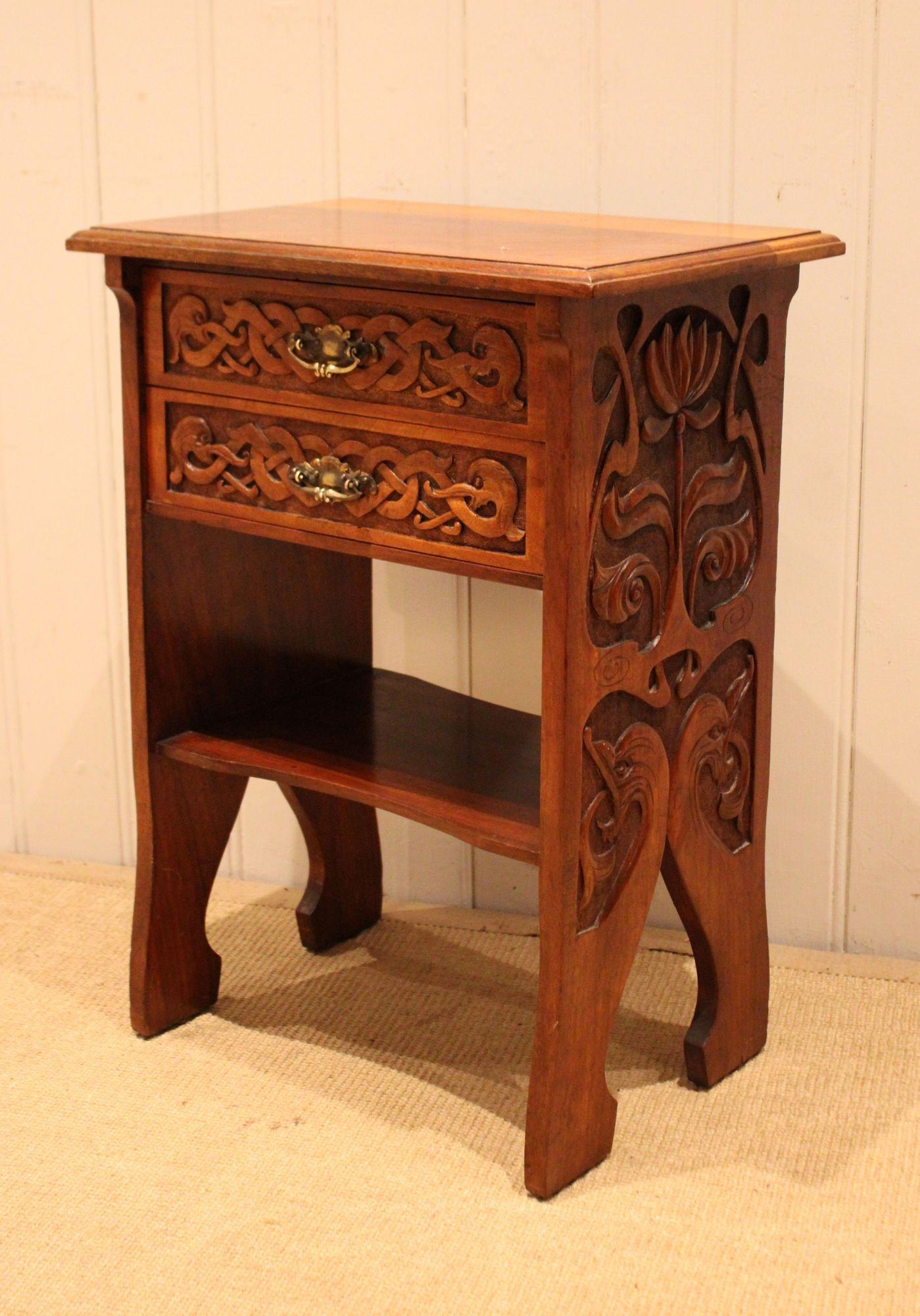 Solid walnut Art Nouveau cabinet having two drawers above an under-tier, with heavily carved stylized floral sides, raised on shaped supports.