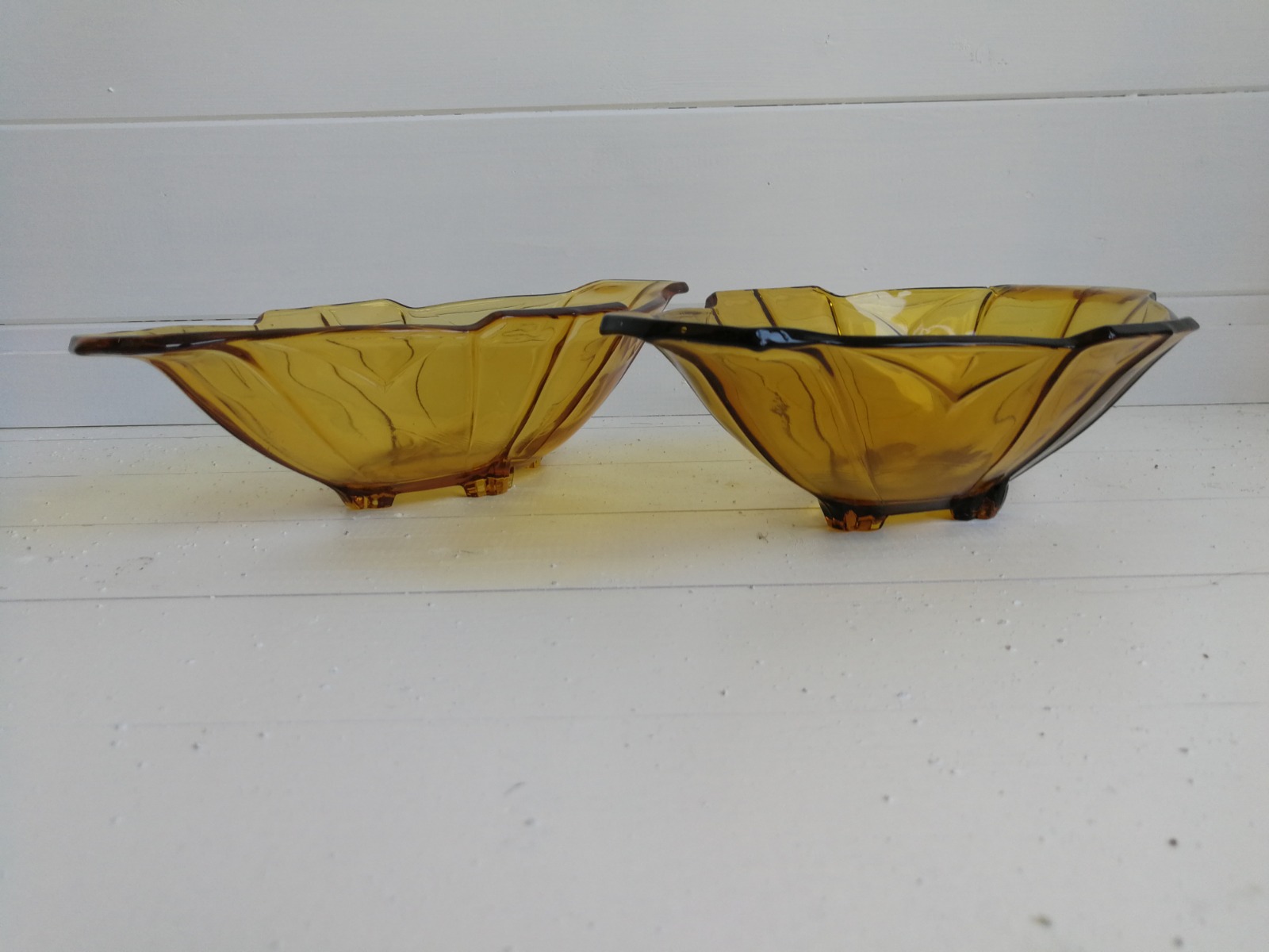 Sowerby Art Deco Amber Pressed Glass 2 Oval Footed Serving Bowls / Dishes – Chevron Design Pattern No 2631 – Made in England c.1930