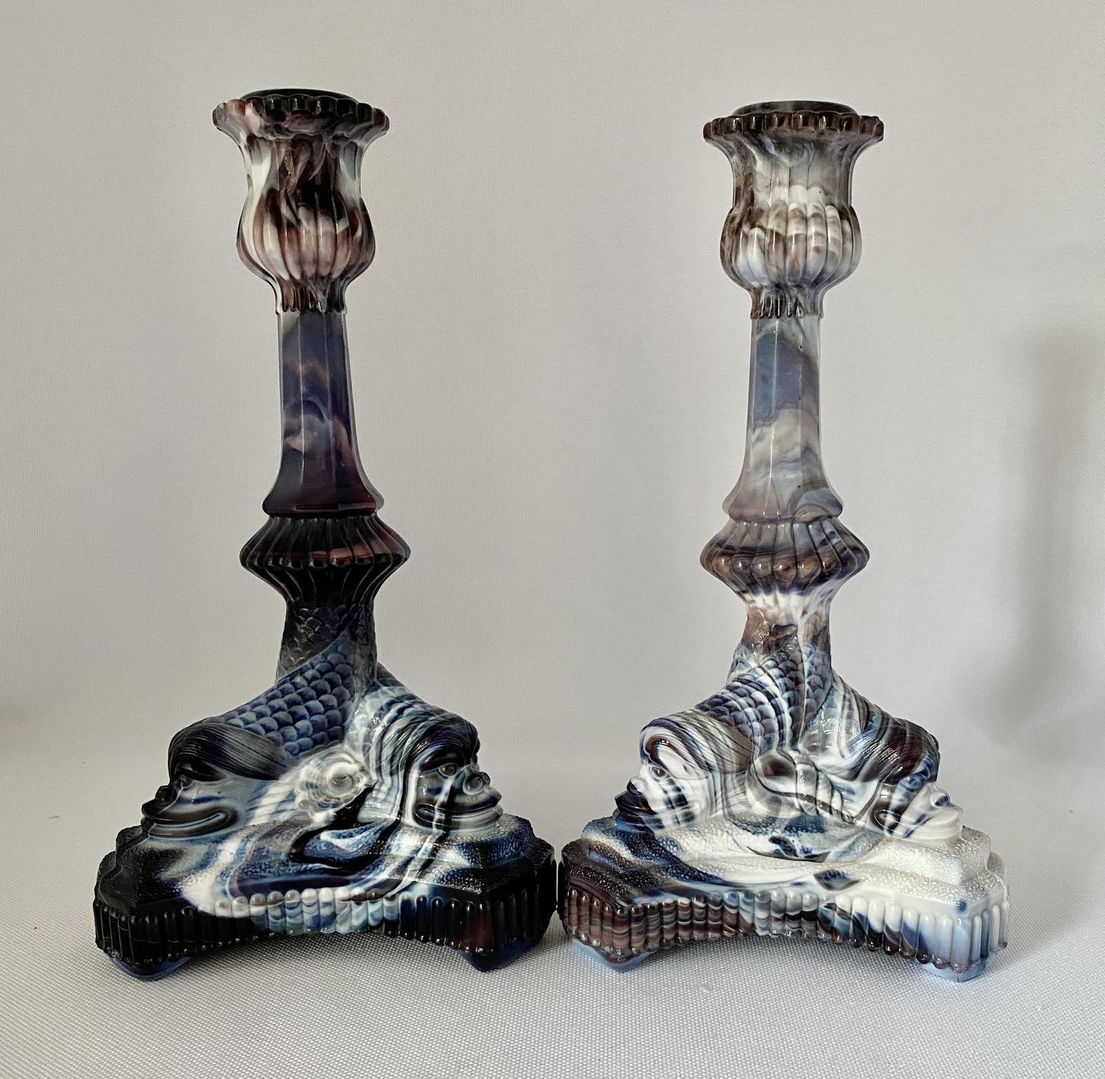 Sowerby Purple Malachite Slag Glass Candlesticks c.1880