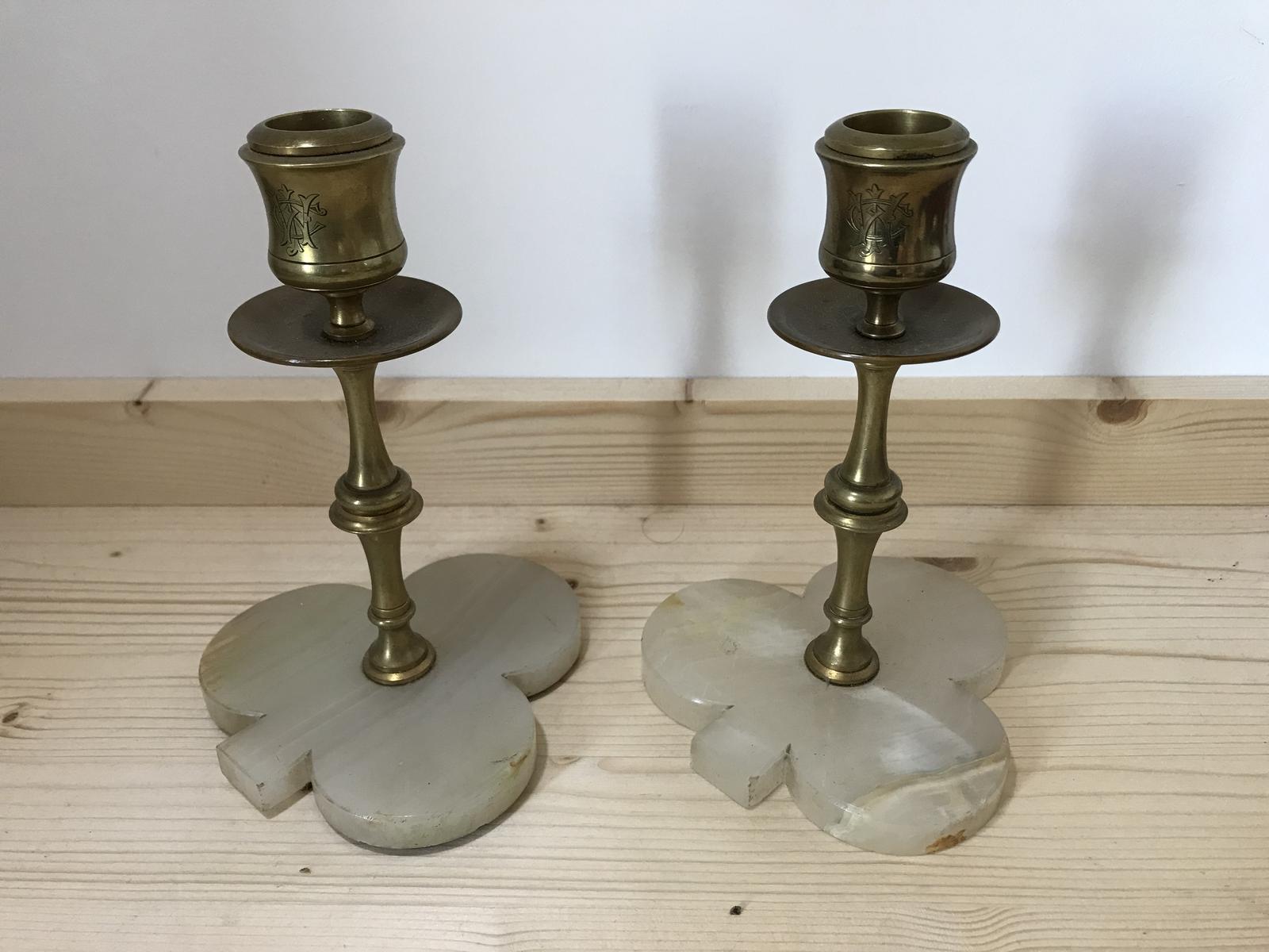 Splendid Victorian Gilt Brass & Alabaster Clubs Bridge Candlesticks