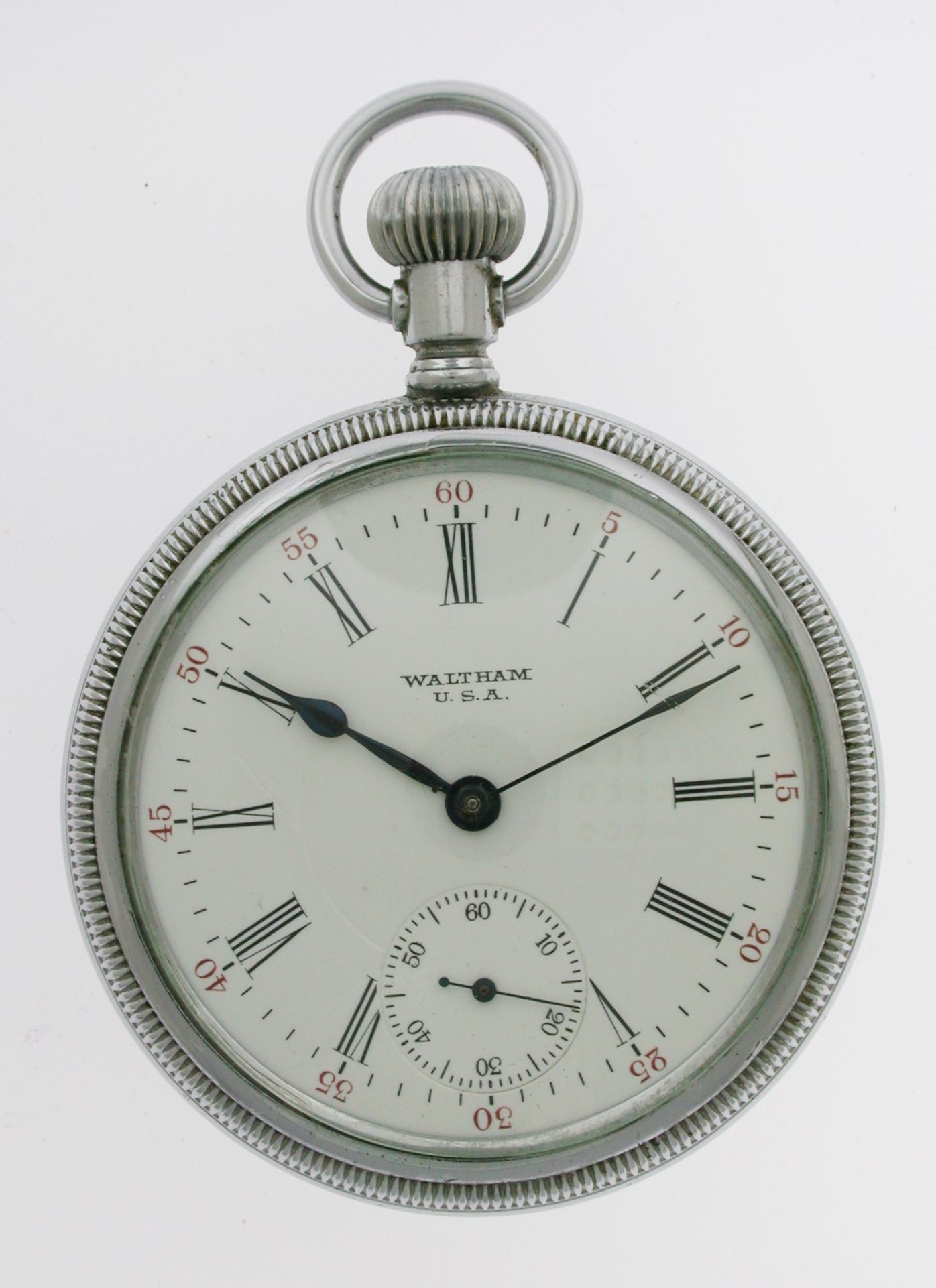 Dial: The bright and clear white enamel dial has got black roman numerals, a subsidiary seconds dial at the six, blued steel hands and is signed: “Waltham USA.”