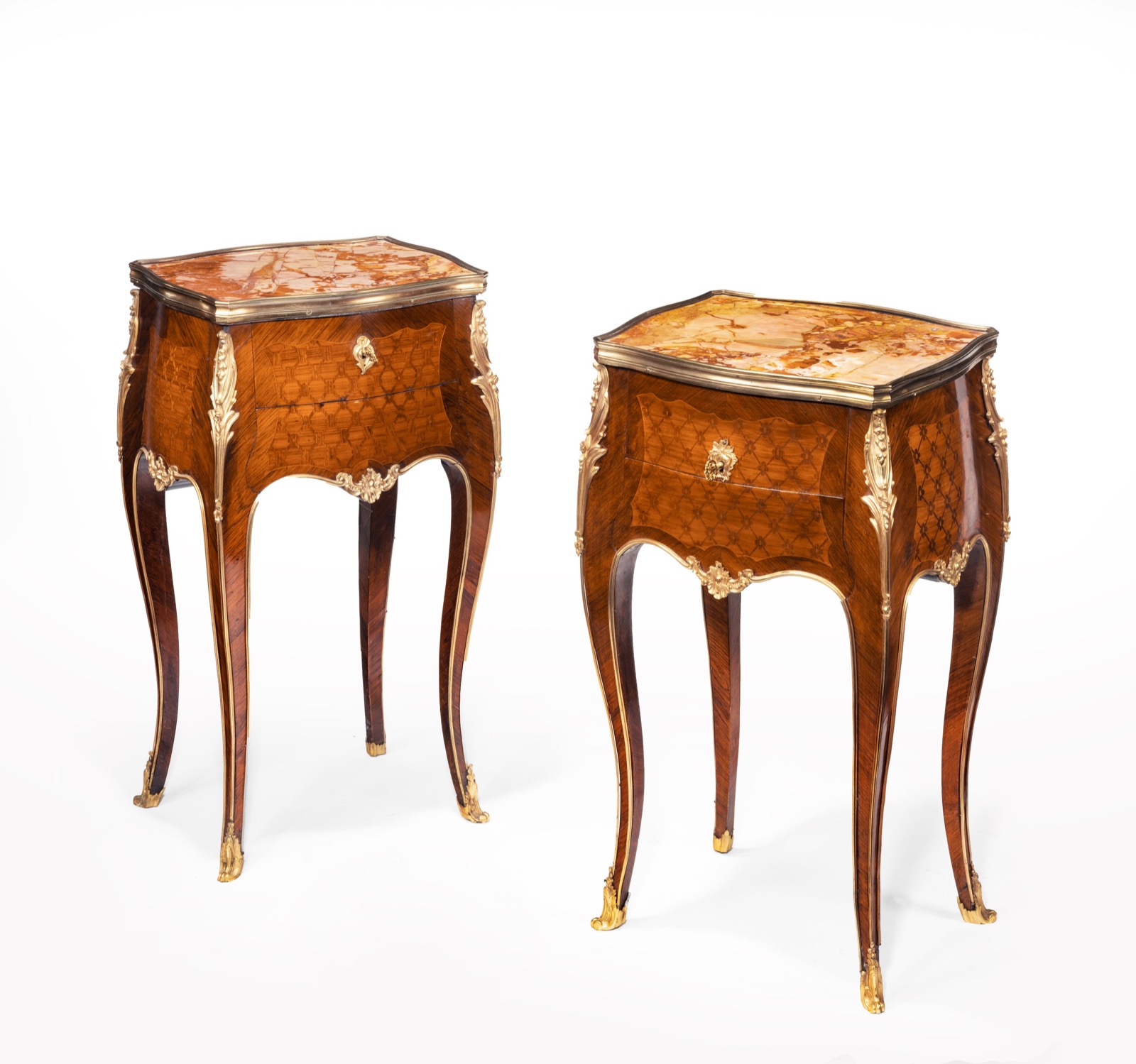 Stamped Gillows Pair of French Ormolu Mounted Rosewood & Kingwood Parquetry Bedside Tables