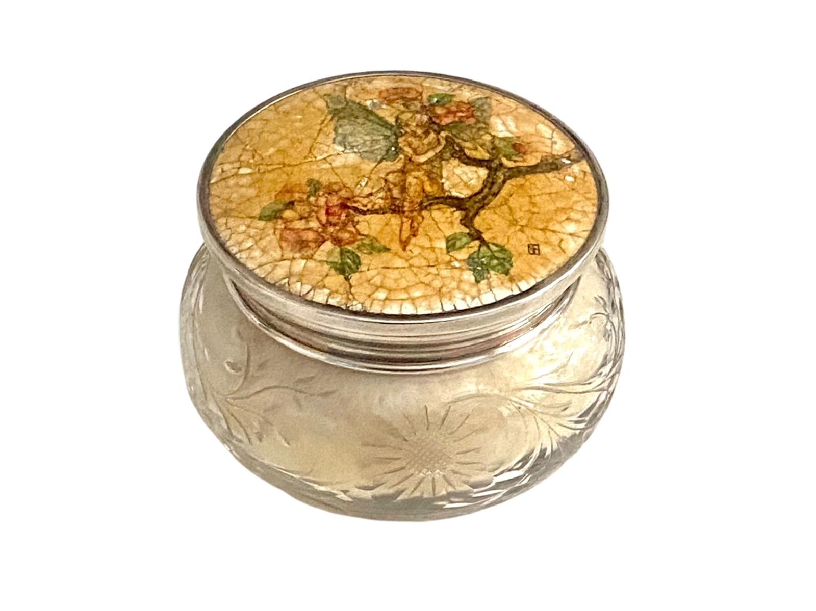 Sterling Silver & Crackle Glaze Enamelled Fairy Dressing Table / Powder Pot Birmingham 1927
