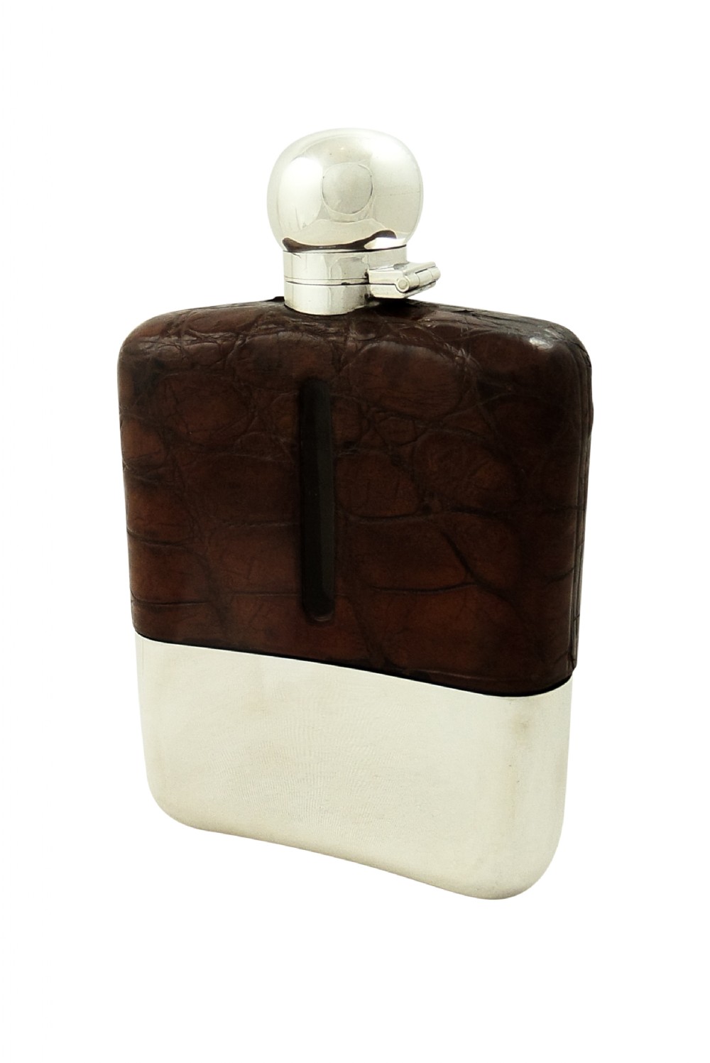Sterling Silver & Crocodile Half Pint Hip Flask 1930