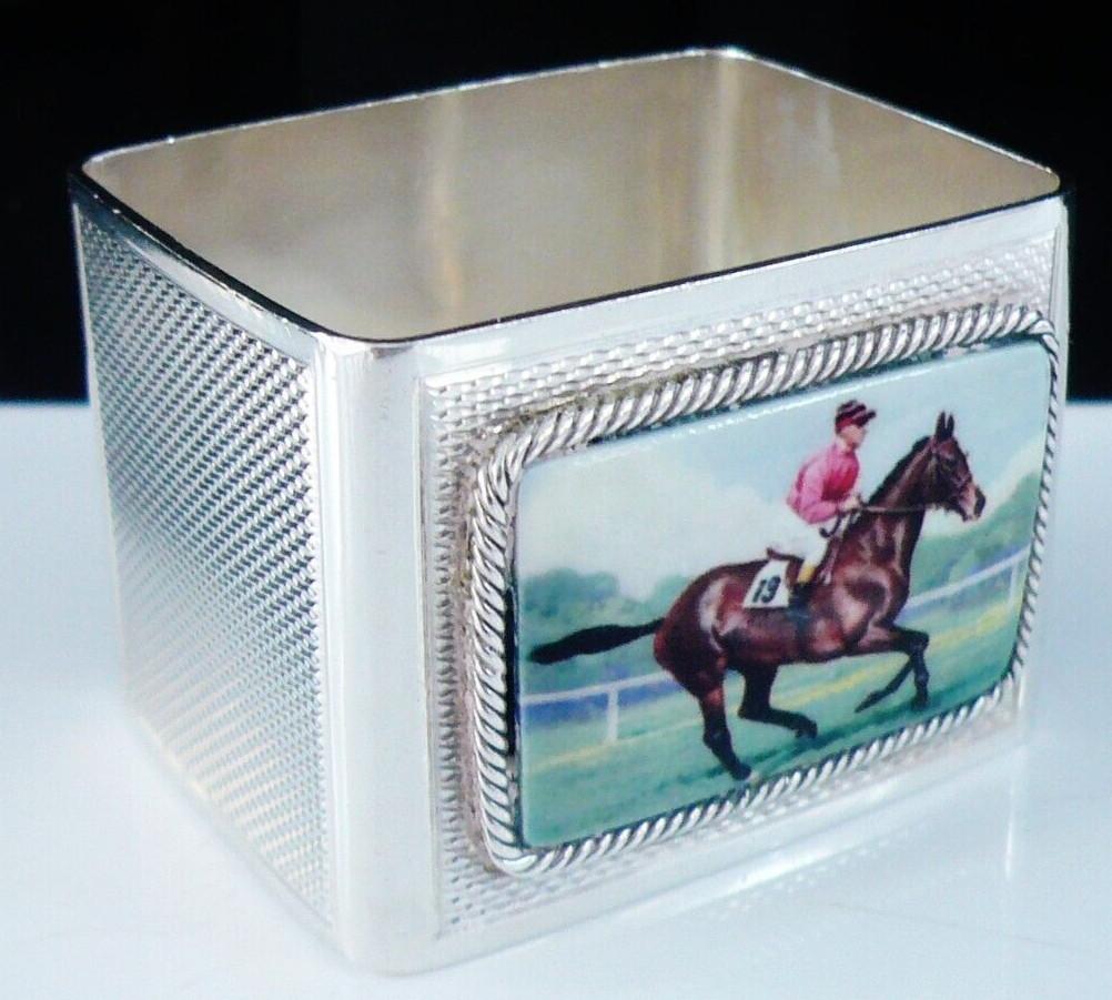 Exquisite English sterling silver napkin ring with an enamel panel depicting a race horse and jockey, the horse is wearing number 19.