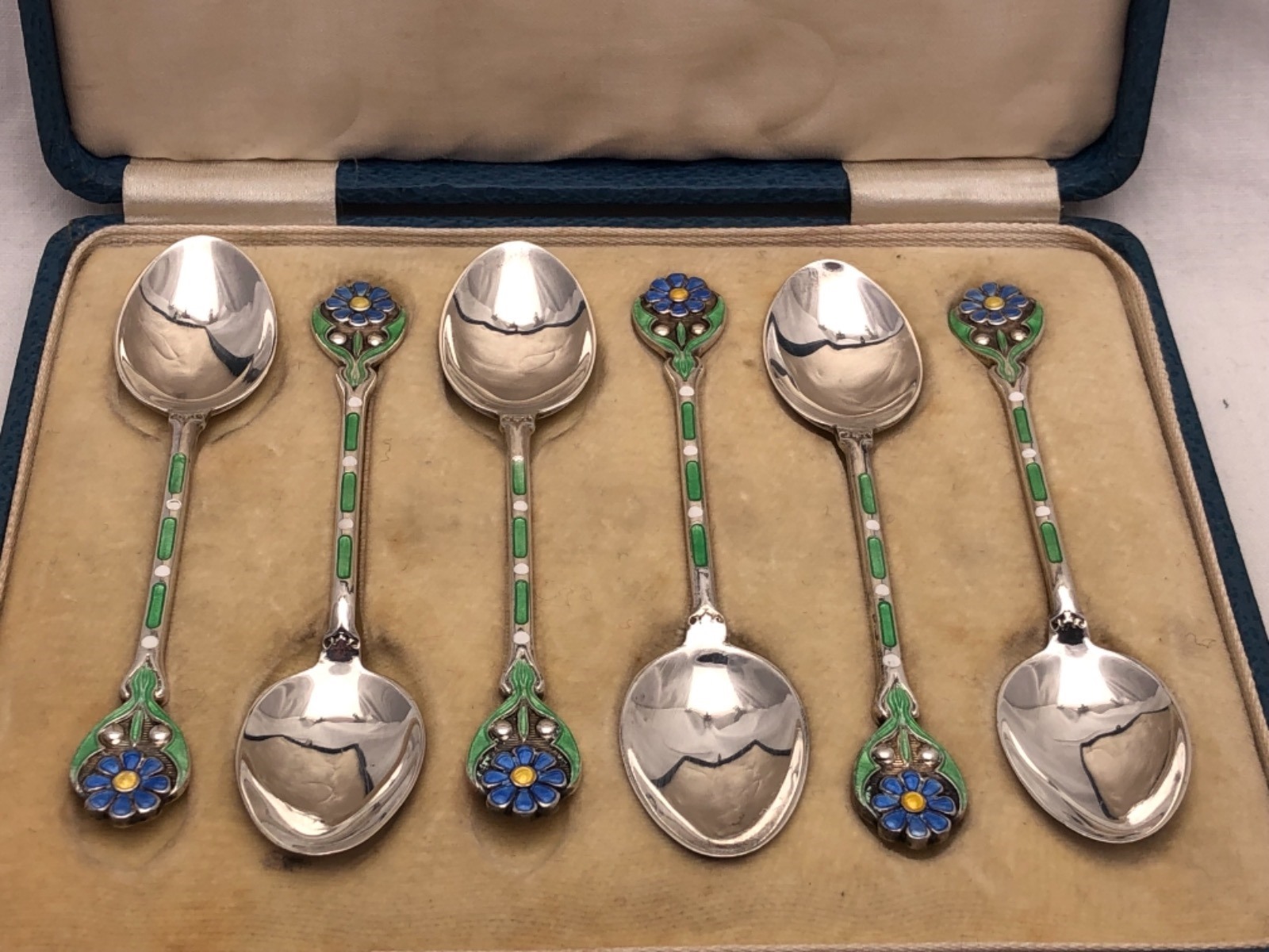 Sterling Solid Silver Set of 6 Flower Enamelled Spoons Cased
