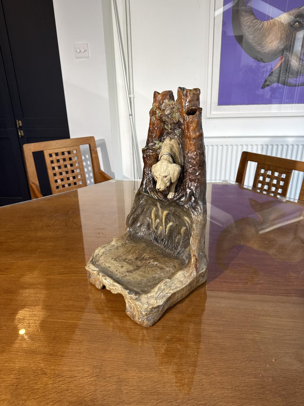 19th/20th century terracotta stick stand designed by August Otto and modelled with a dog, trees and foliage, one chip to bottom left at the back otherwise in good condition for age. Impressed factory mark to base, artist's mark on the back.
