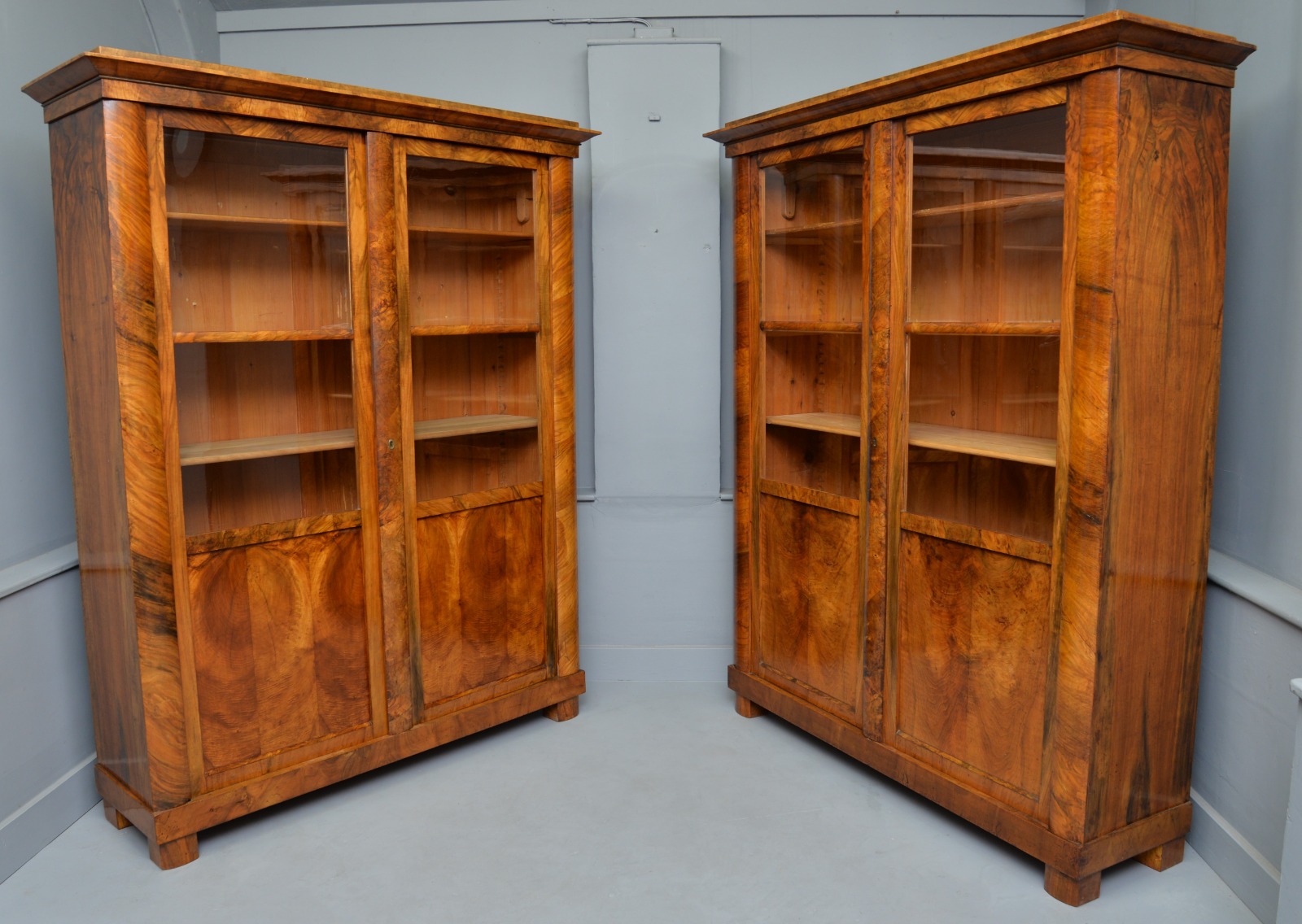 Striking Pair of Biedermeier Figured Walnut Bookcase Cabinets