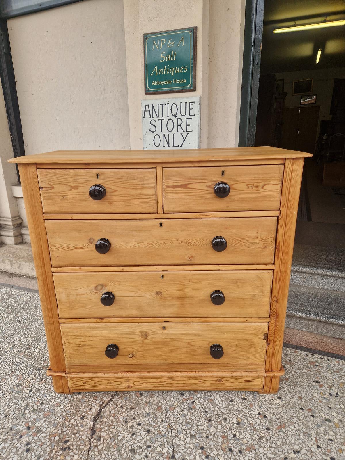 A large late 19th Century Victorian antique stripped pine chest of drawers in good condition and of a lovely colour. Comprising of two drawers over three larger graduated ones finished off with the original black porcelain knobs.