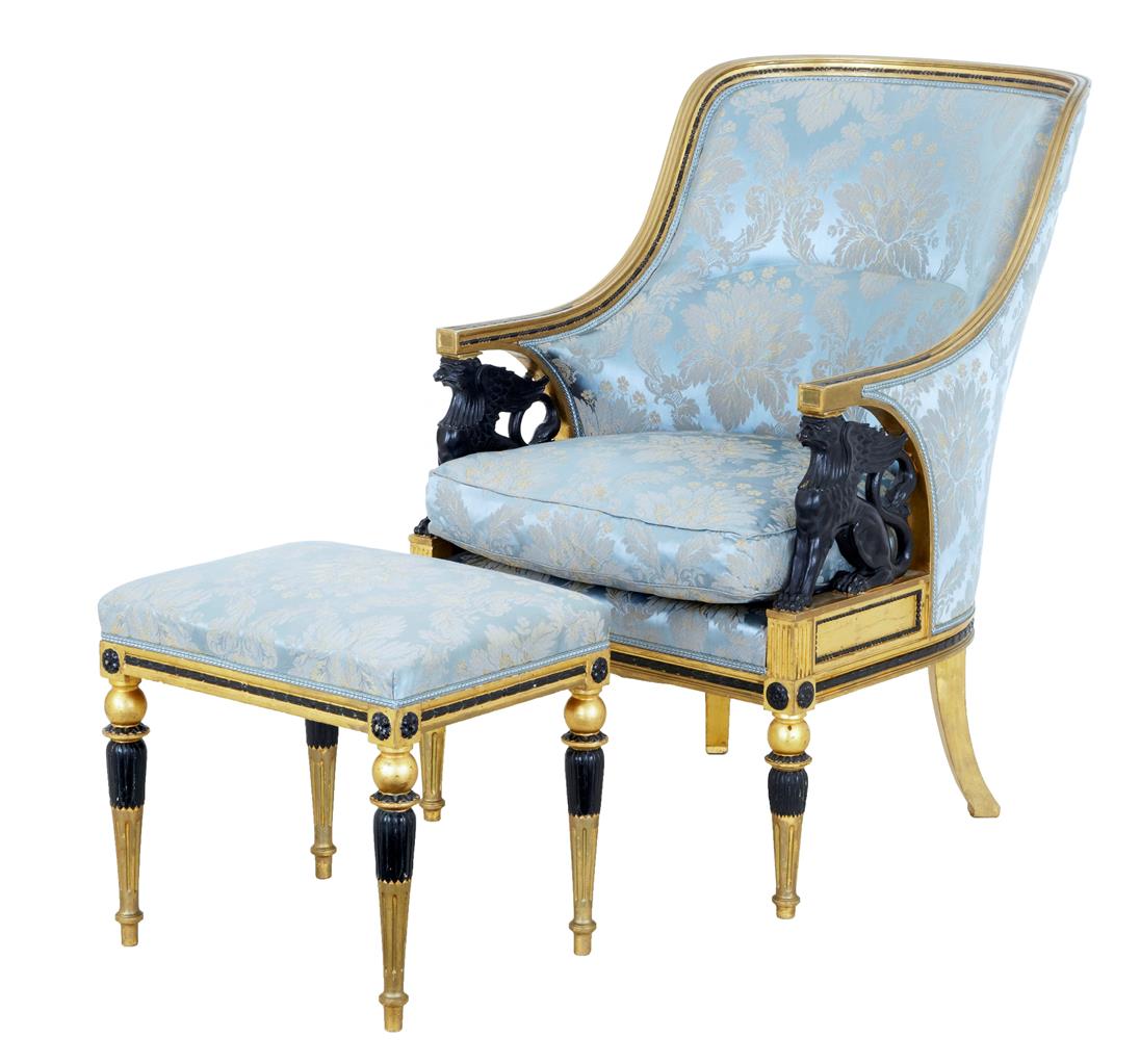 Stunning 19th Century Swedish Gothenburg Gilt Armchair & Stool
