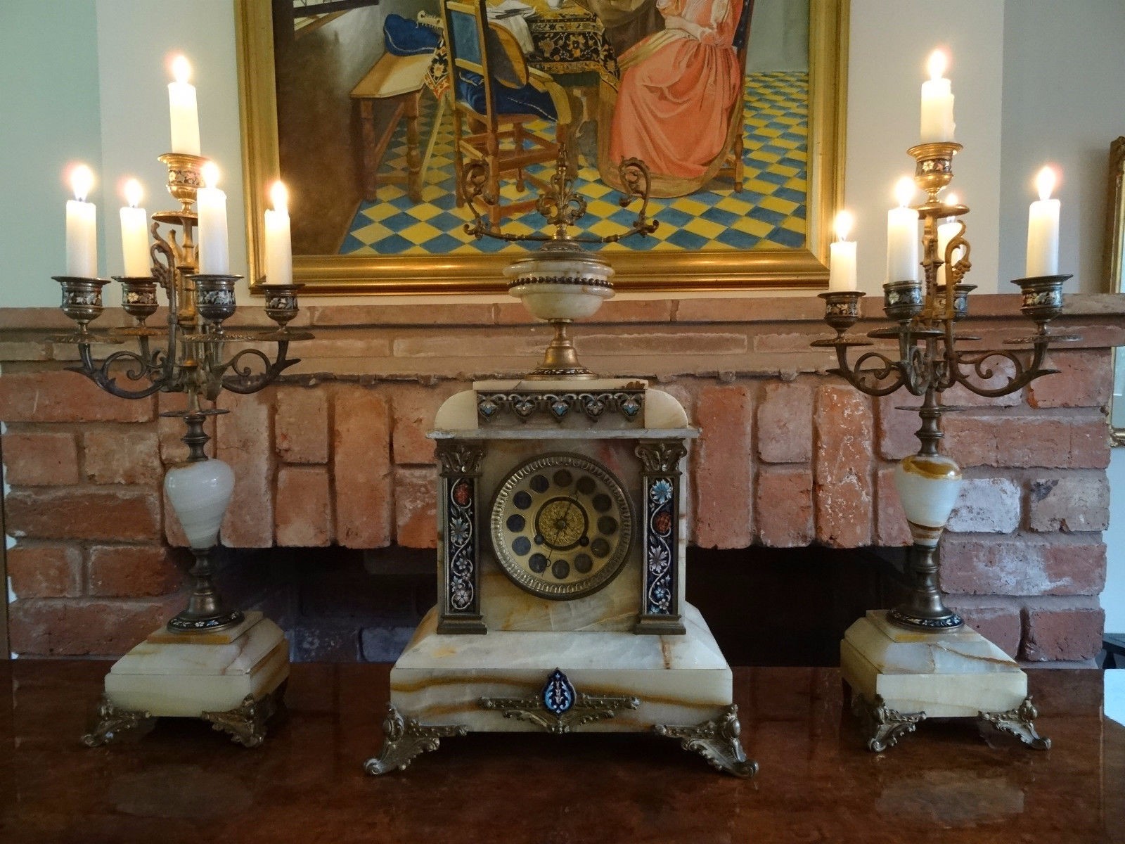 Stunning 3 Piece 19th Century Onyx & Chinoiserie Clock Set Garniture Candelabra Candle