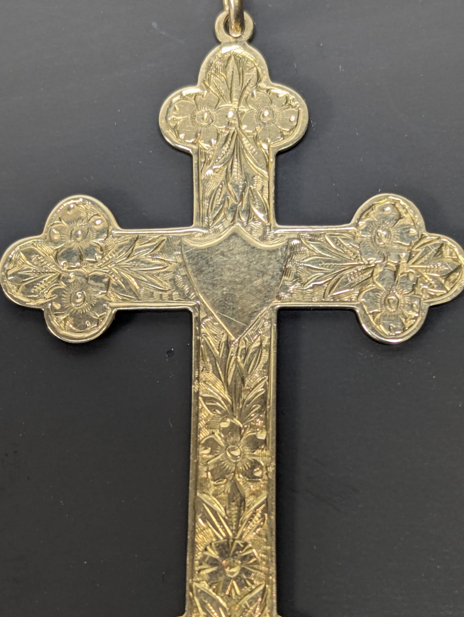 This is a 9ct gold cross, designed in the Edwardian style. The cross features intricate detailing typical of the period, showcasing the craftsmanship of early 20th-century jewellery.