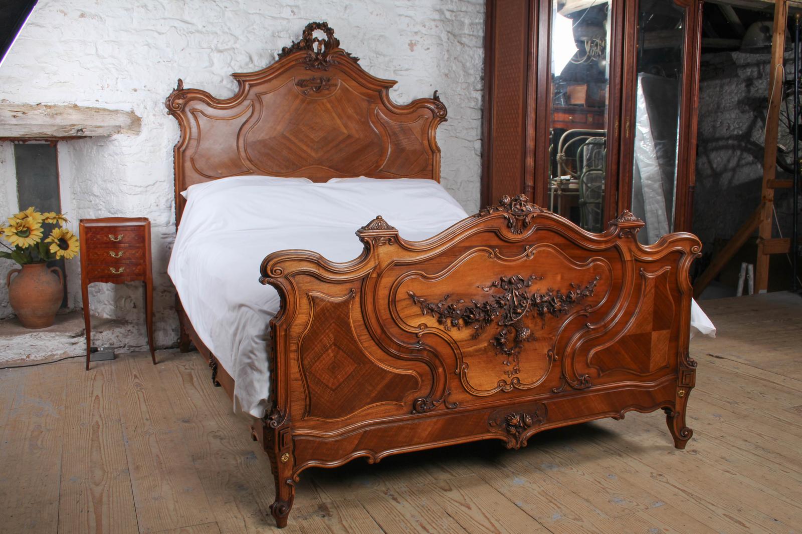 Absolutely stunningly Louis XIV style king size bed. Brimming with detail and fabulous shaping. The head end has a lovely foliate garland for the crest, with further ribbon carving within the garland. Below this sits a stunning carving of Arrows, quiver and band which achieves a great sense of depth and dimension. The head end has three raised panels with very nice fruitwood quarter veneer detail.