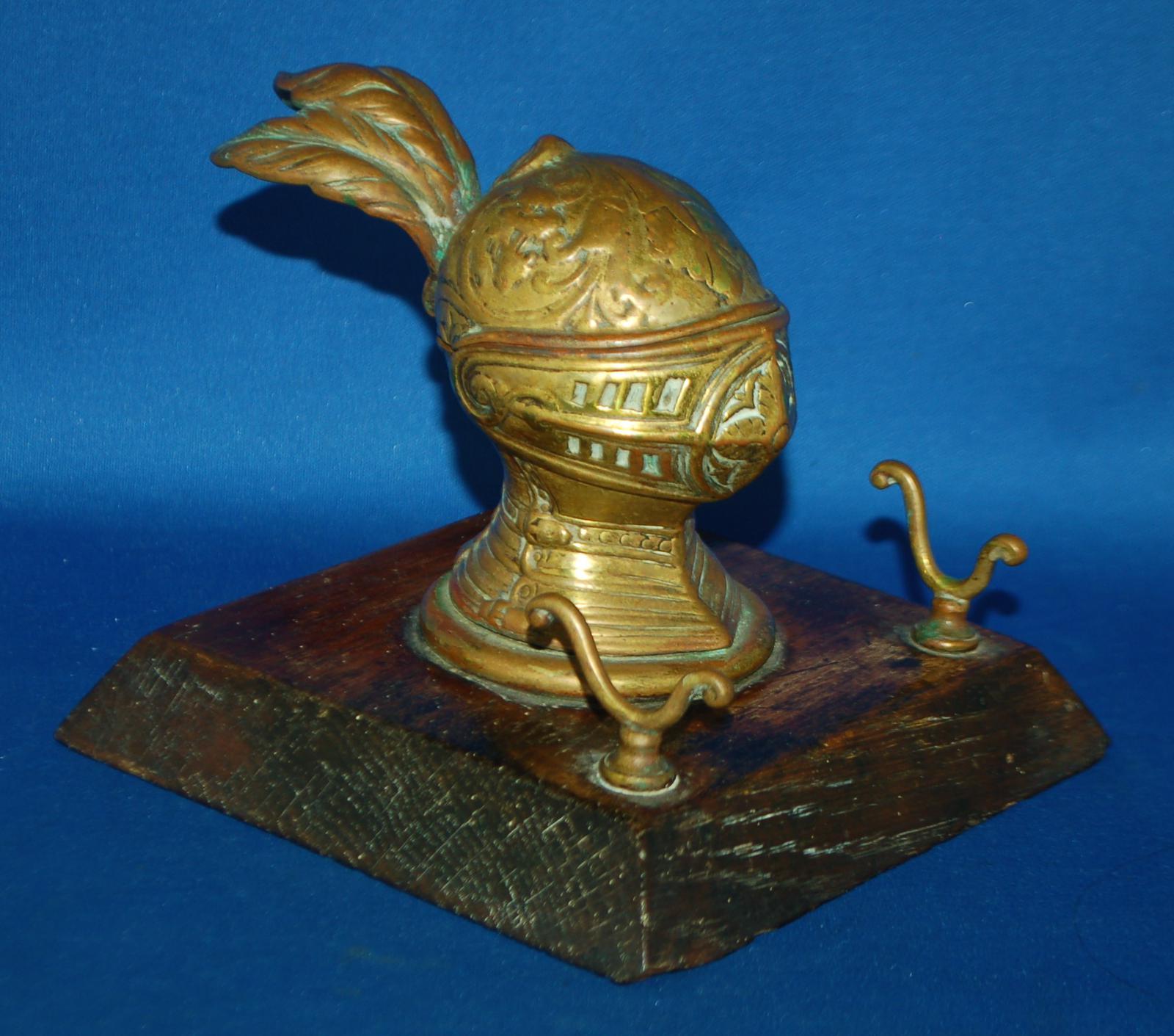 Stunning Antique Brass Knight Helm Inkwell with Pen Rest, Oak Base