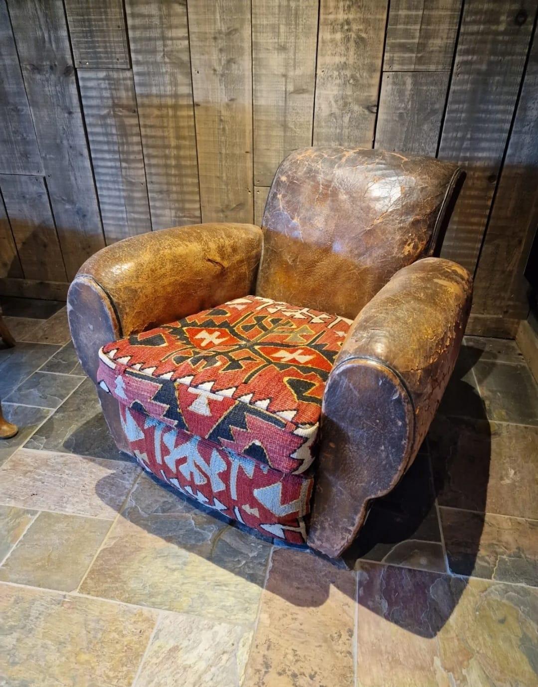 Stunning Antique French Leather & Kilim Covered Club Chair