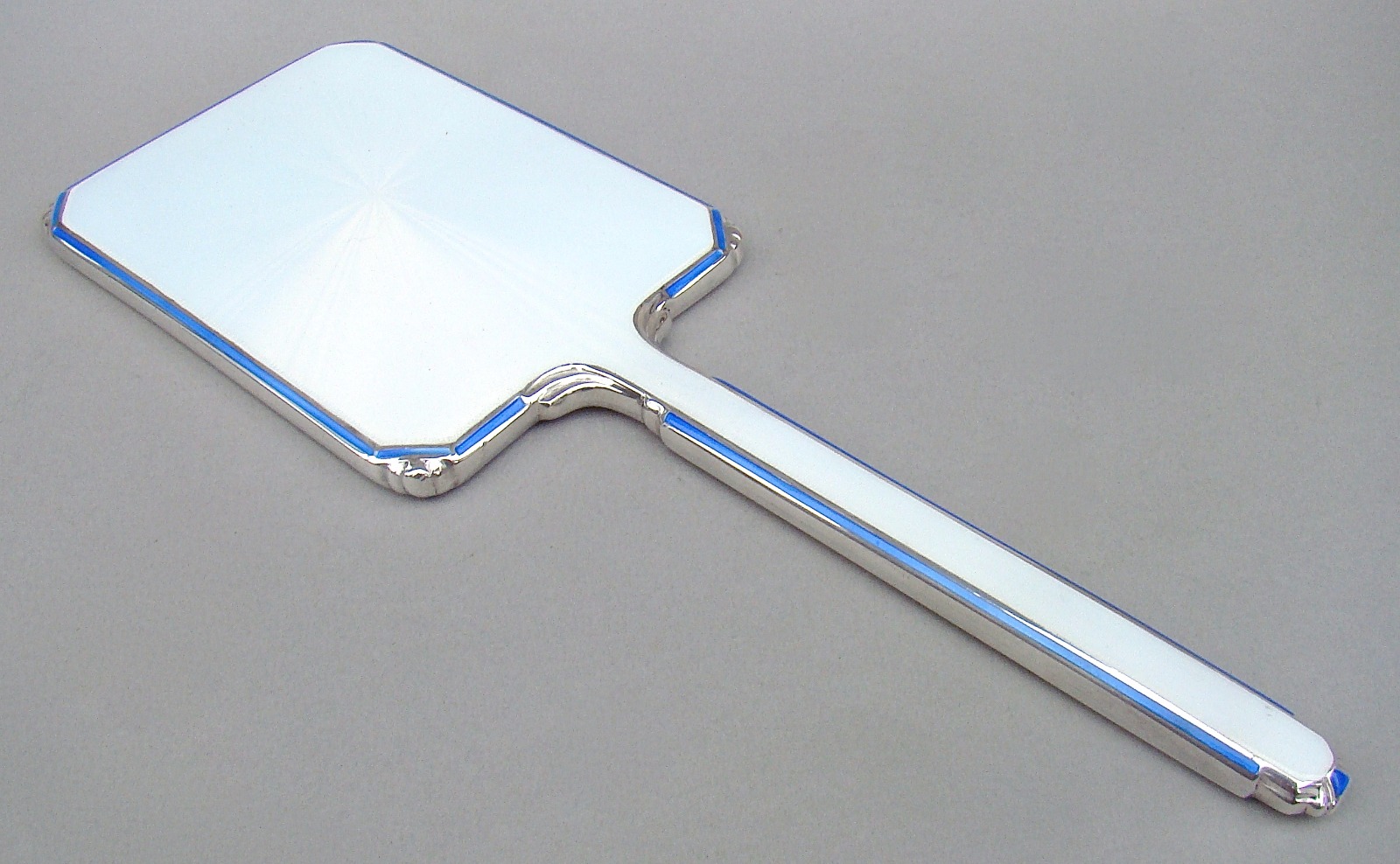 Stunning Art Deco Silver and Dual Colour Guilloche Enamel Hand Mirror by the Adie Brothers, Birmingham 1922