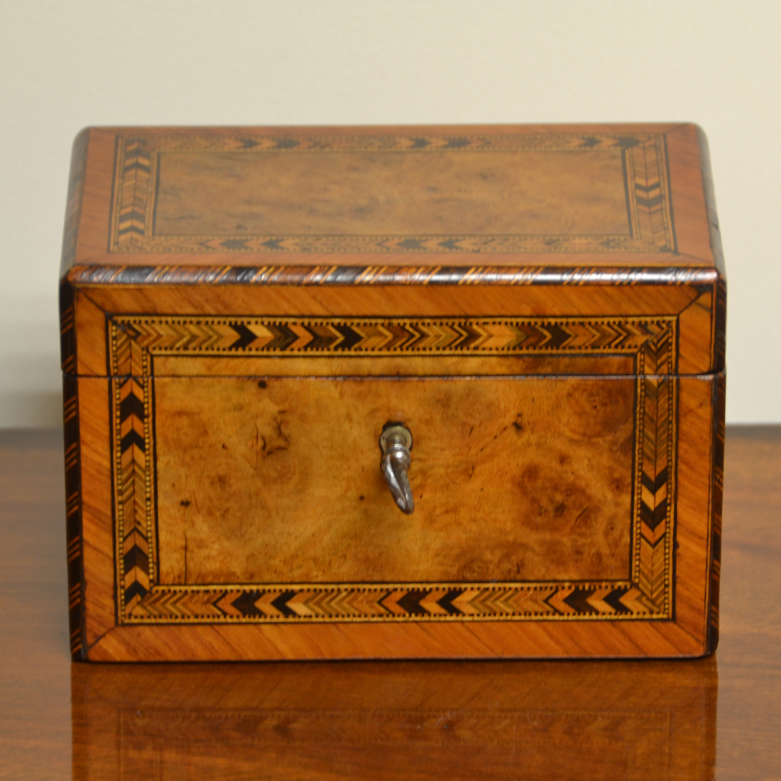 Stunning Burr Walnut, Tunbridge Inlaid Small Antique Tea Caddy