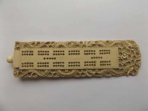 Stunning Chinese Ivory Cribbage Board Decorated with Dragons