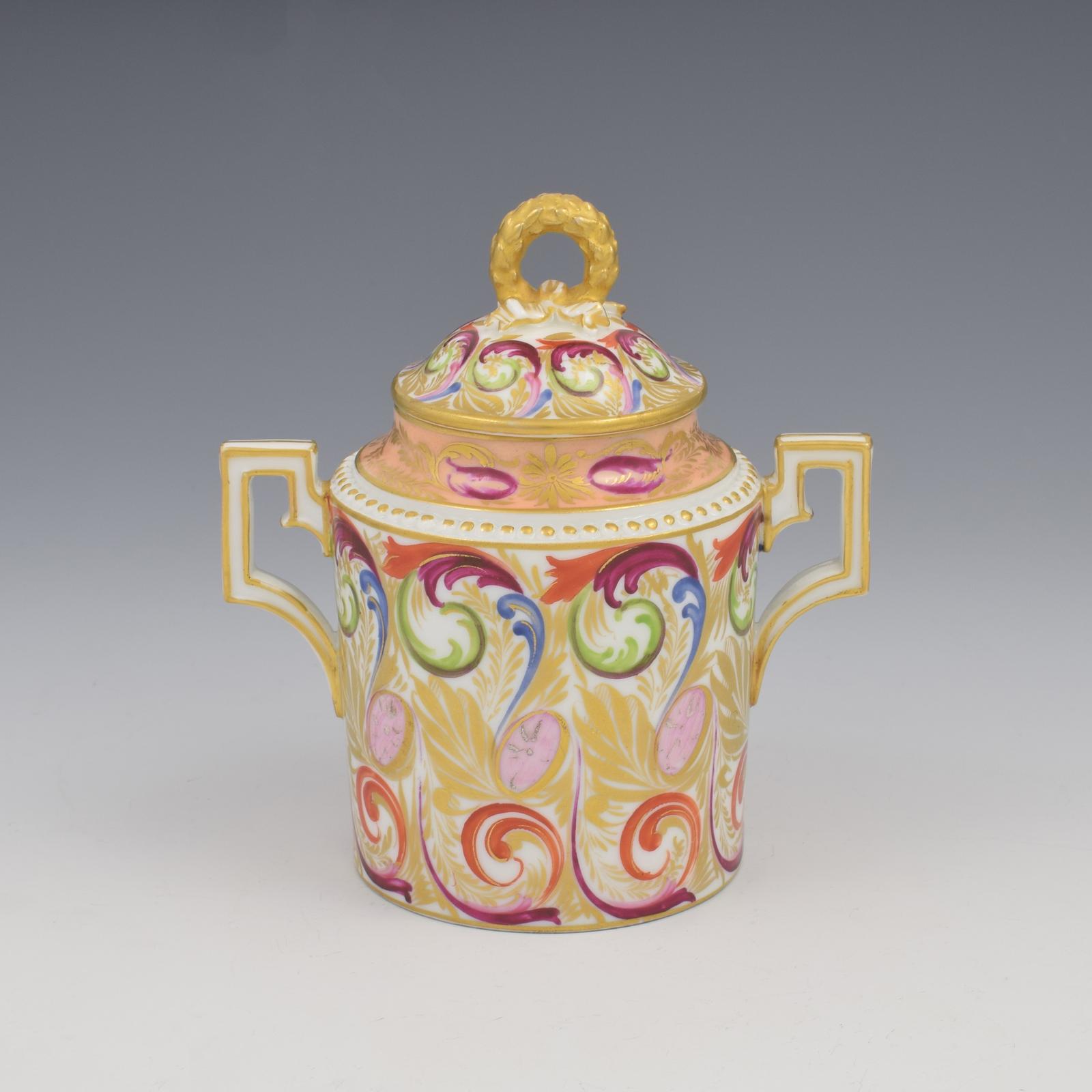 A very fine Derby chocolate cup and cover with fluted, squared side handles and raised beading around the shoulder. The domed cover has an ornately modelled knop formed as a laurel wreath secured with ribbons (these knops are usually just simple rings). A fabulously riotous pattern of enamelled feathery scrolls in scarlet, plum, green, blue and pale pink, intermingling with a background of stylised gilded acanthus leaves. The incurved shoulder is coloured in an apricot ground with gilt leaves and flowers, and splashes of plum enamel. The knop, beading and all rims and edges are also gilded. The base has the red painted crown over crossed swords and D mark, but unusually, the initials E and V (or R) are painted either side where the three dots would usually sit. c.1805-1810.