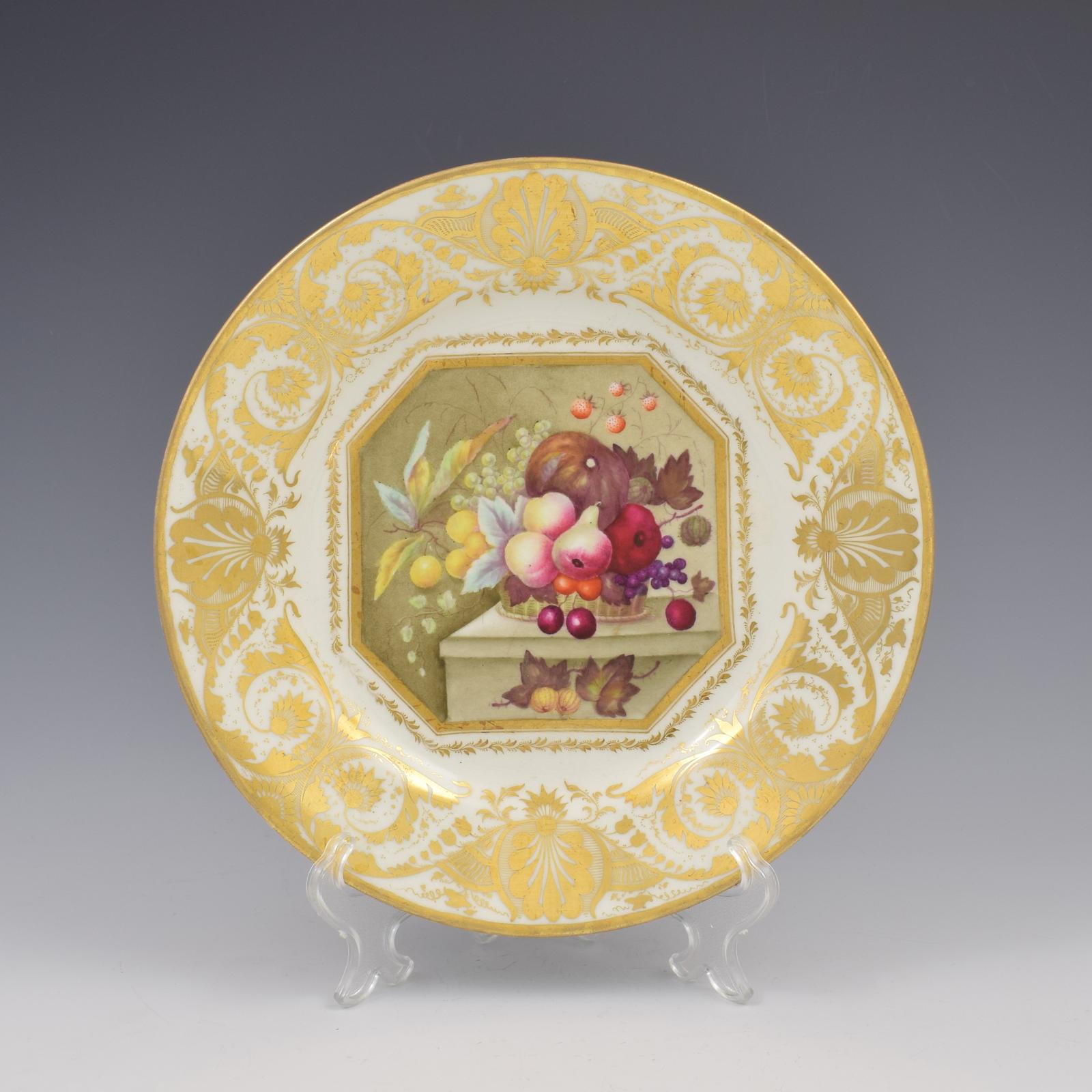 A beautiful early 19th century Derby porcelain dessert plate with a large octagonal central vignette painted by Thomas Steele. A large array of fruit, spilling from a basket set on a marble slab, superbly painted, and edged in gilt. A very fine gilt arabesque border runs around the edge of the plate. Red painted mark to the base and the number for gilder 36. c.1820.