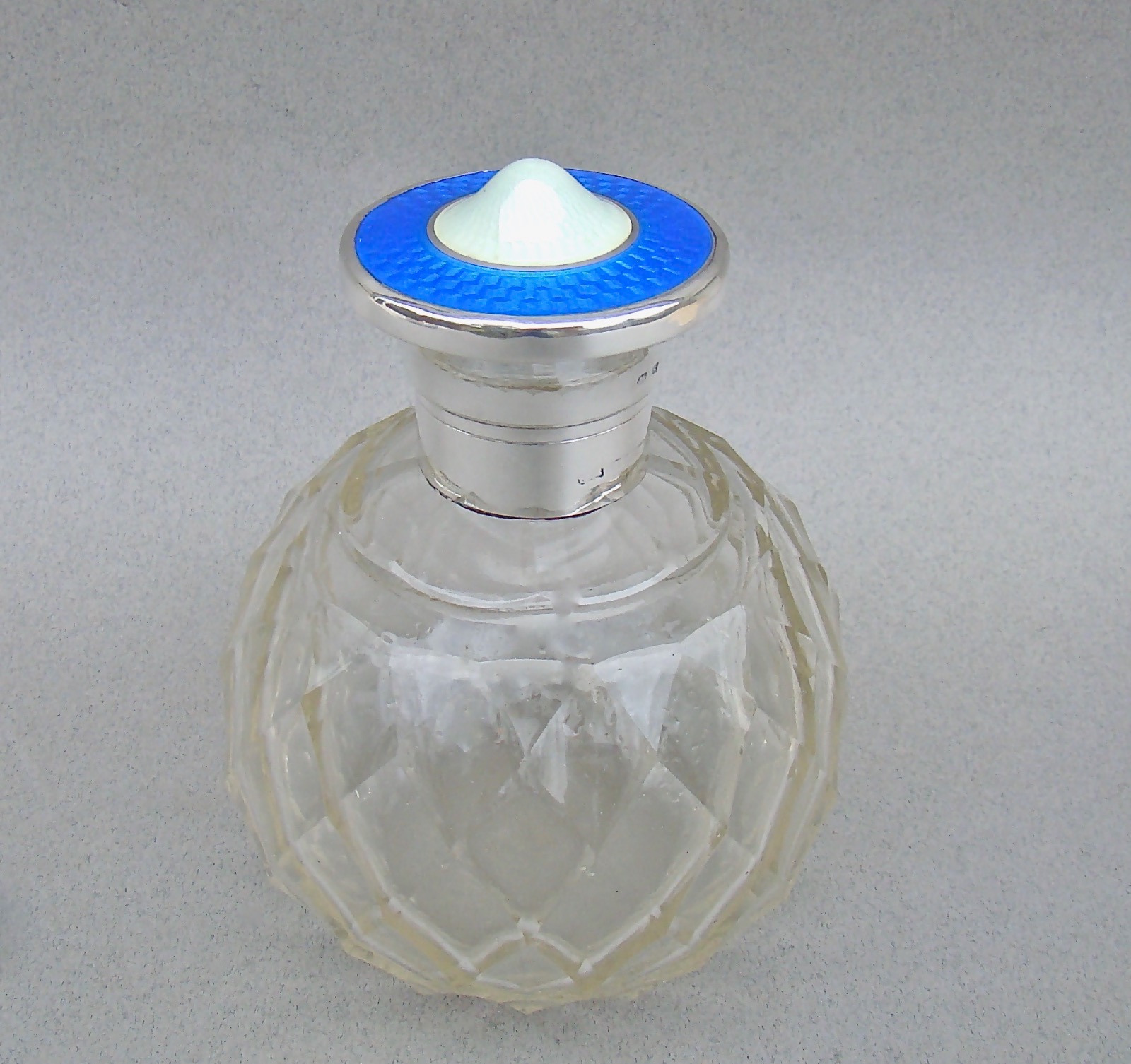 Stunning Edwardian Silver, Blue & White Guilloche Enamel, Cut Glass Scent Bottle, Birmingham 1907
