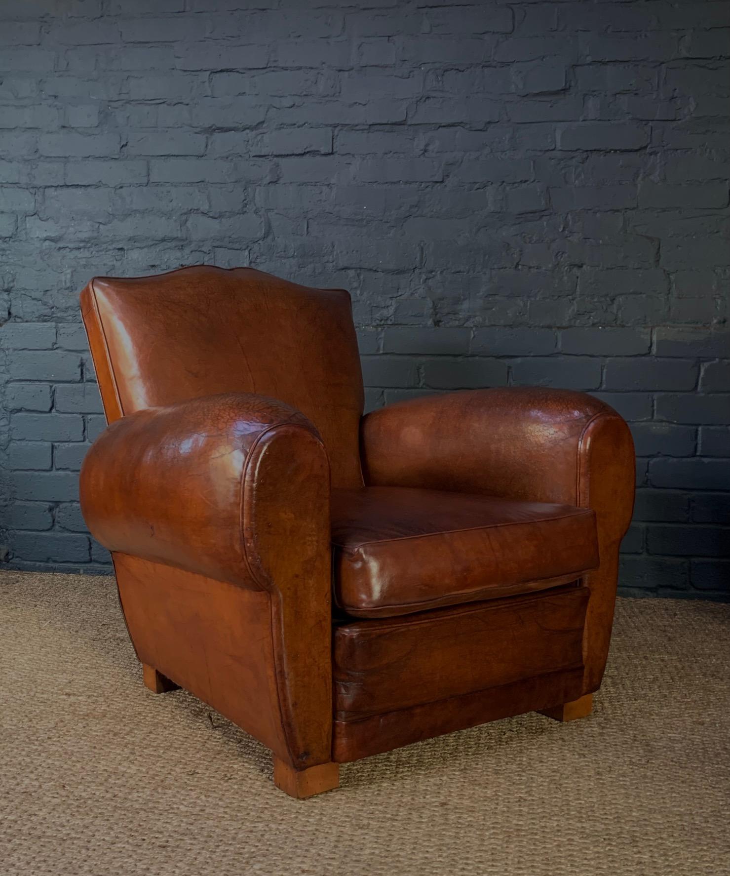 Stunning French Leather Club Chair, Caramel Moustache Model c.1930