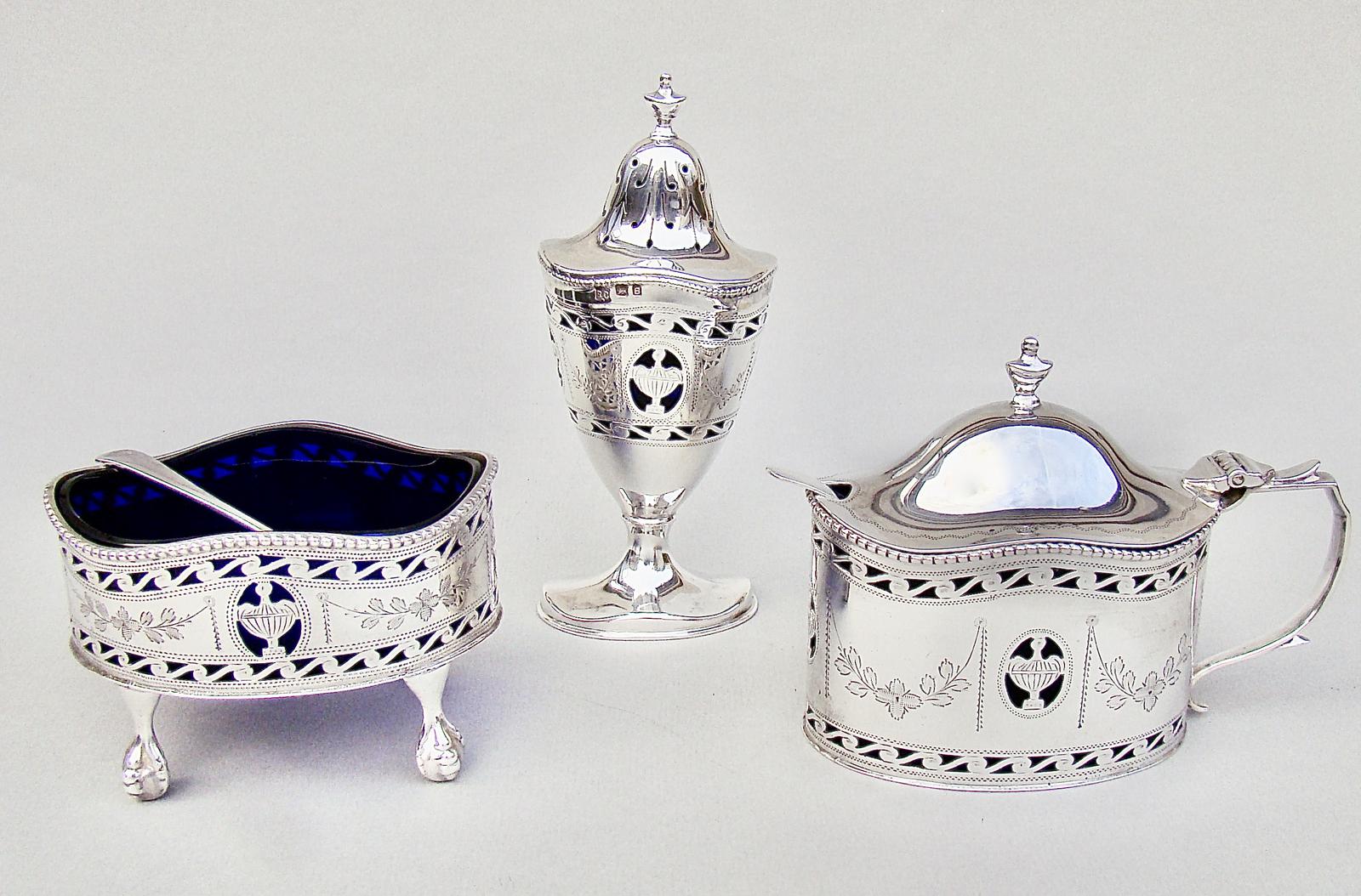 Stunning Georgian Revival Silver Three Piece Condiment Set by William Comyns, London 1940