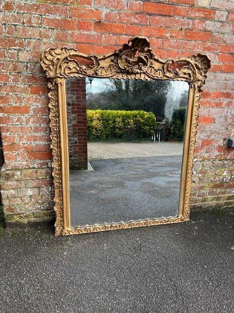 Stunning Large Antique English 19th Century Carved Wood & Gesso Gilt Shaped Top Overmantle Mirror