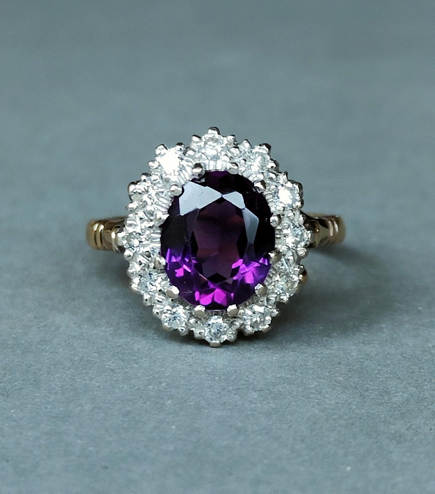 Stunning Large Vintage 18ct Gold Amethyst Diamond Ring