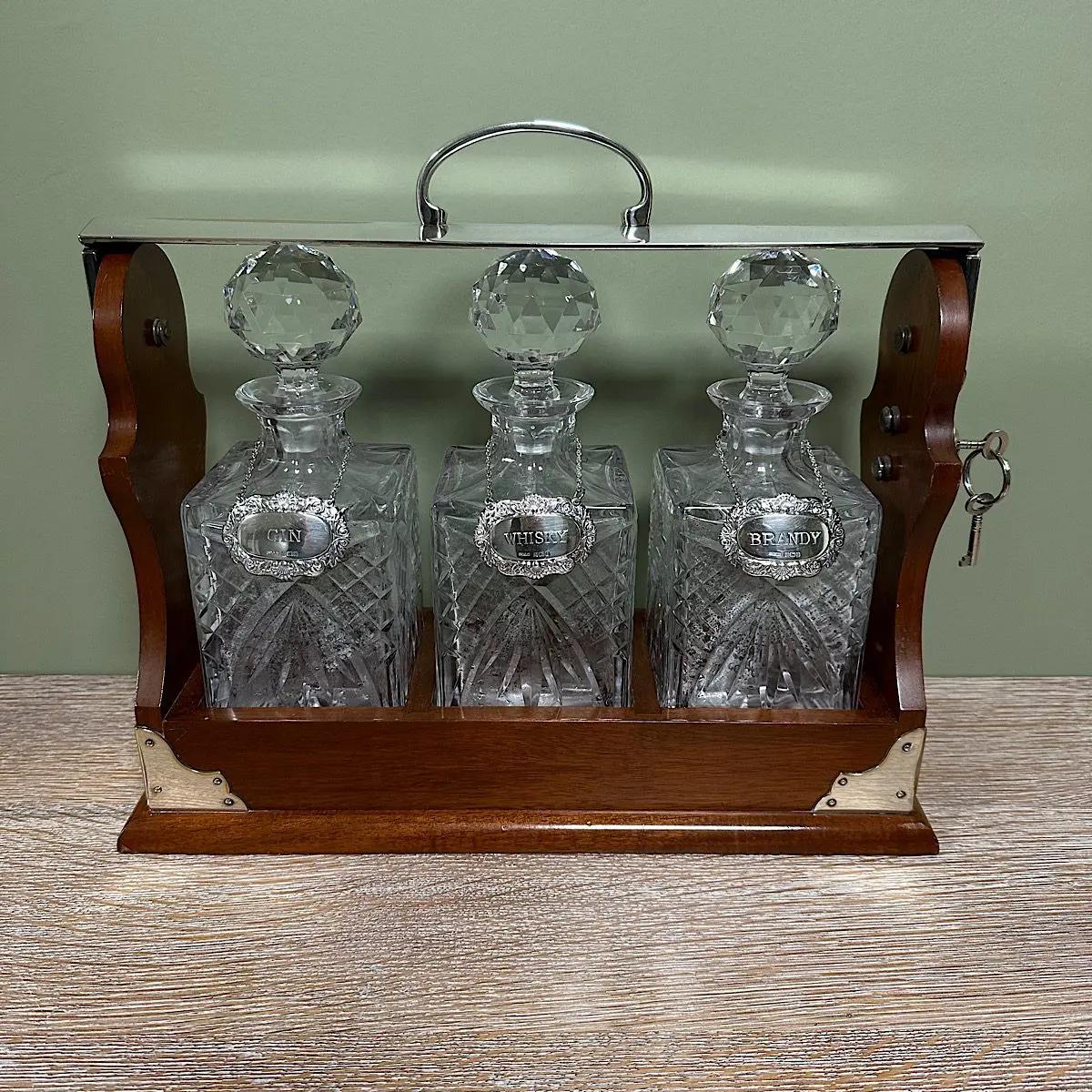 Stunning Mahogany Tantalus with Gin, Whiskey & Brandy Silver Decanter Labels