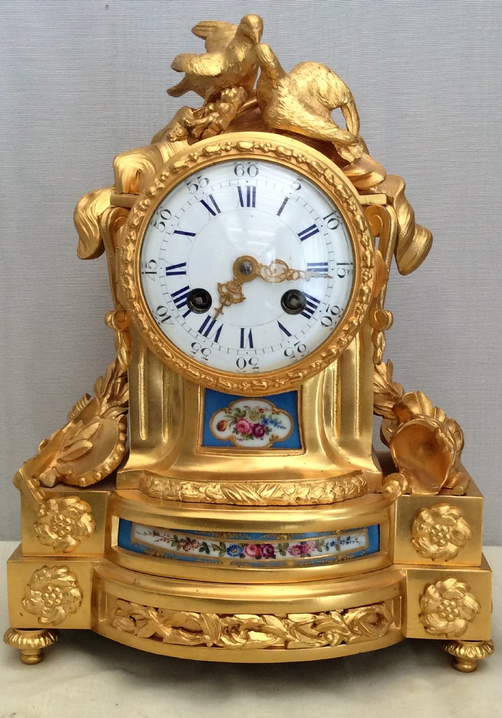 Stunning Ormolu Lovebirds Mantel Clock with Sevres Style Panels - Servant of Paris