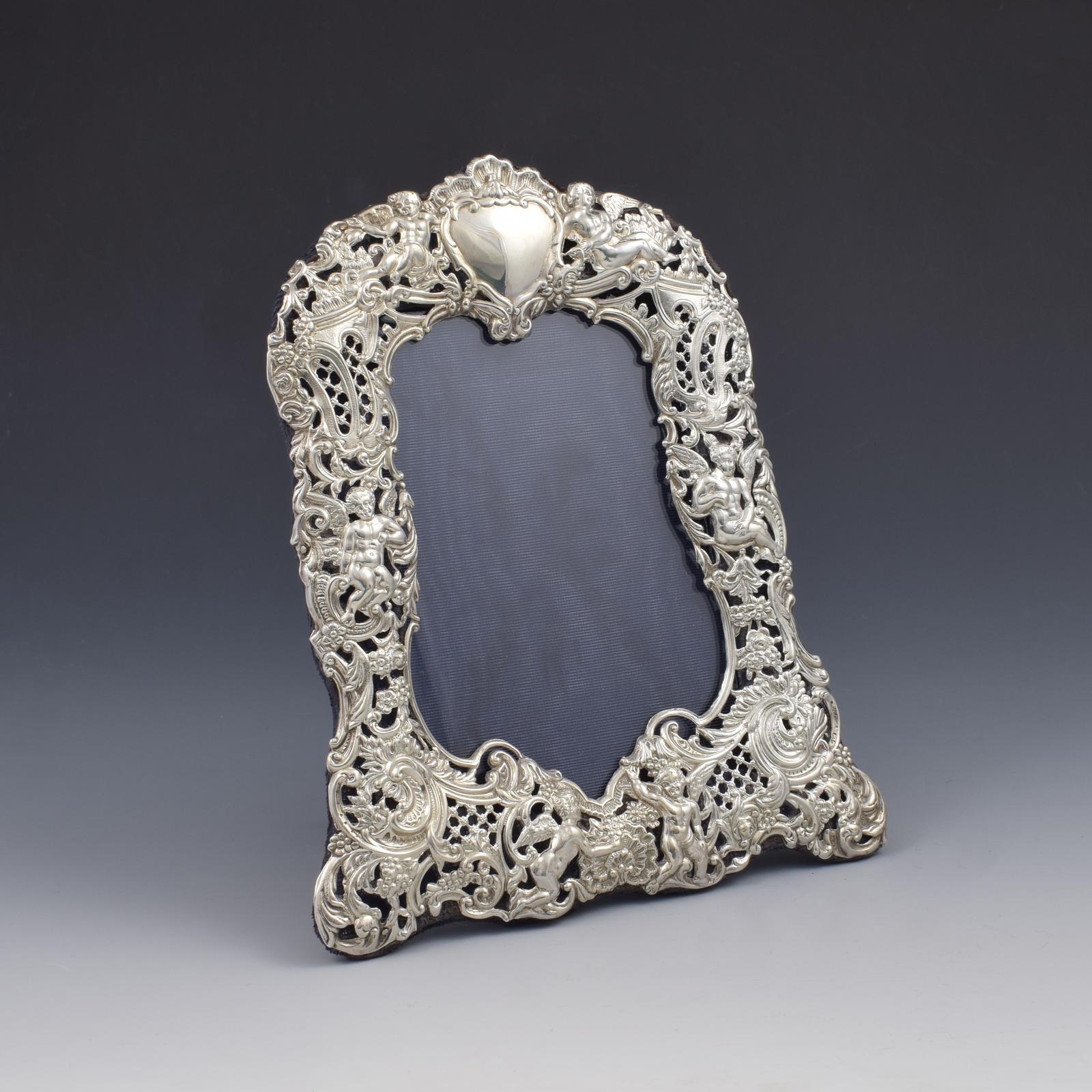 A beautiful, rococo style, sterling silver photograph frame. Embossed and pierced, with ornate scrolls, acanthus leaves, daisy flowers, shells and delicate diaper pattern panels. Six winged children cherubs, in various poses, are placed on each side, at the bottom and either side of the vacant cartouche at the top. Fitted to a blue velvet covered easel back stand. Hallmarked for London 1894, maker William Comyns & Sons.