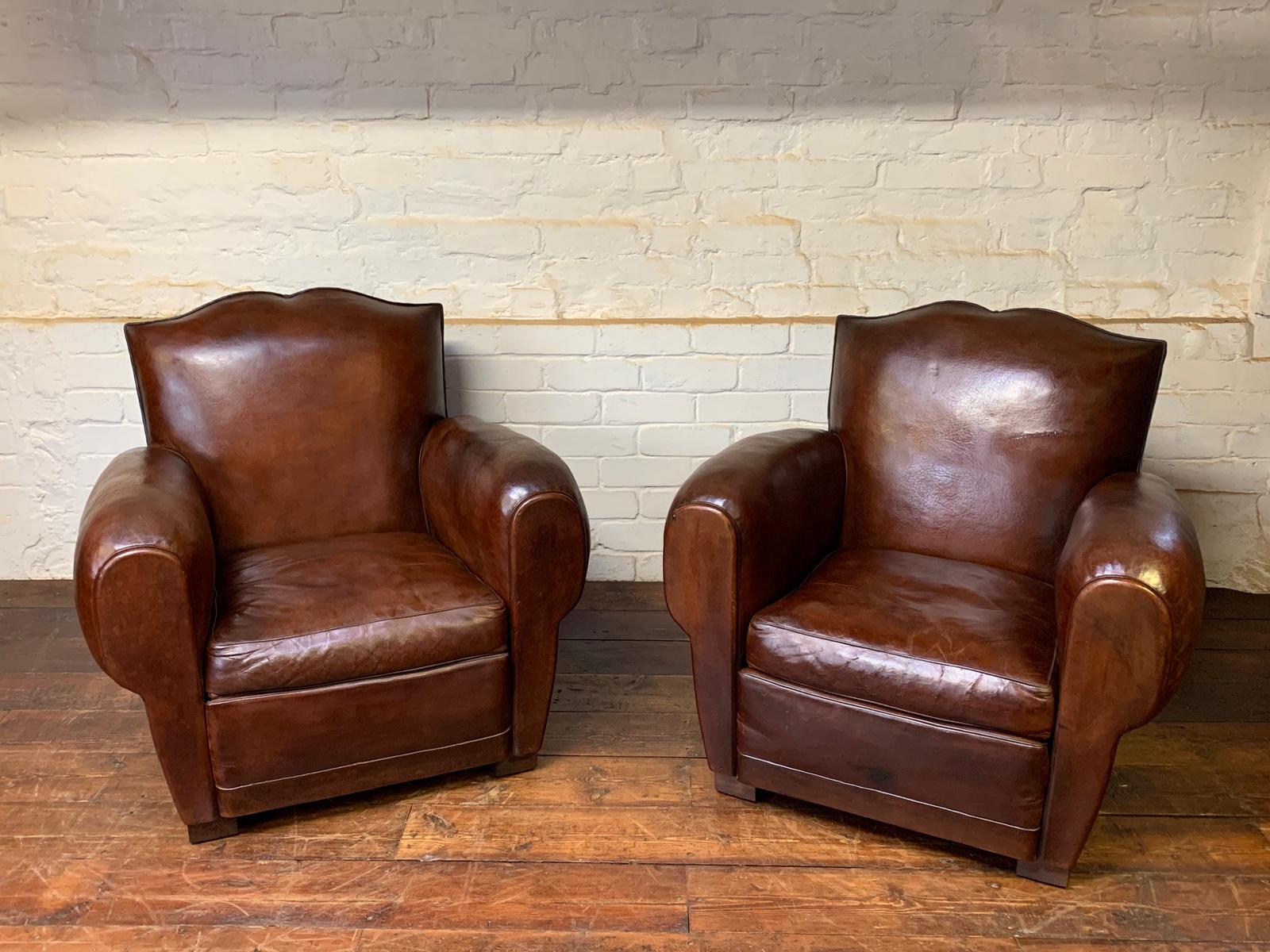 Stunning Pair of 1930s French Leather Club Chairs, Havana Moustache Models
