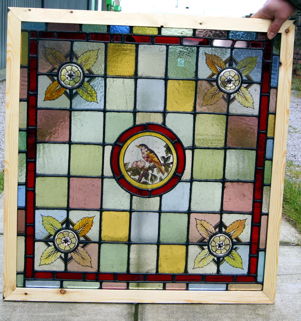 Stunning Pair of Painted Leaded Glass Bird Windows
