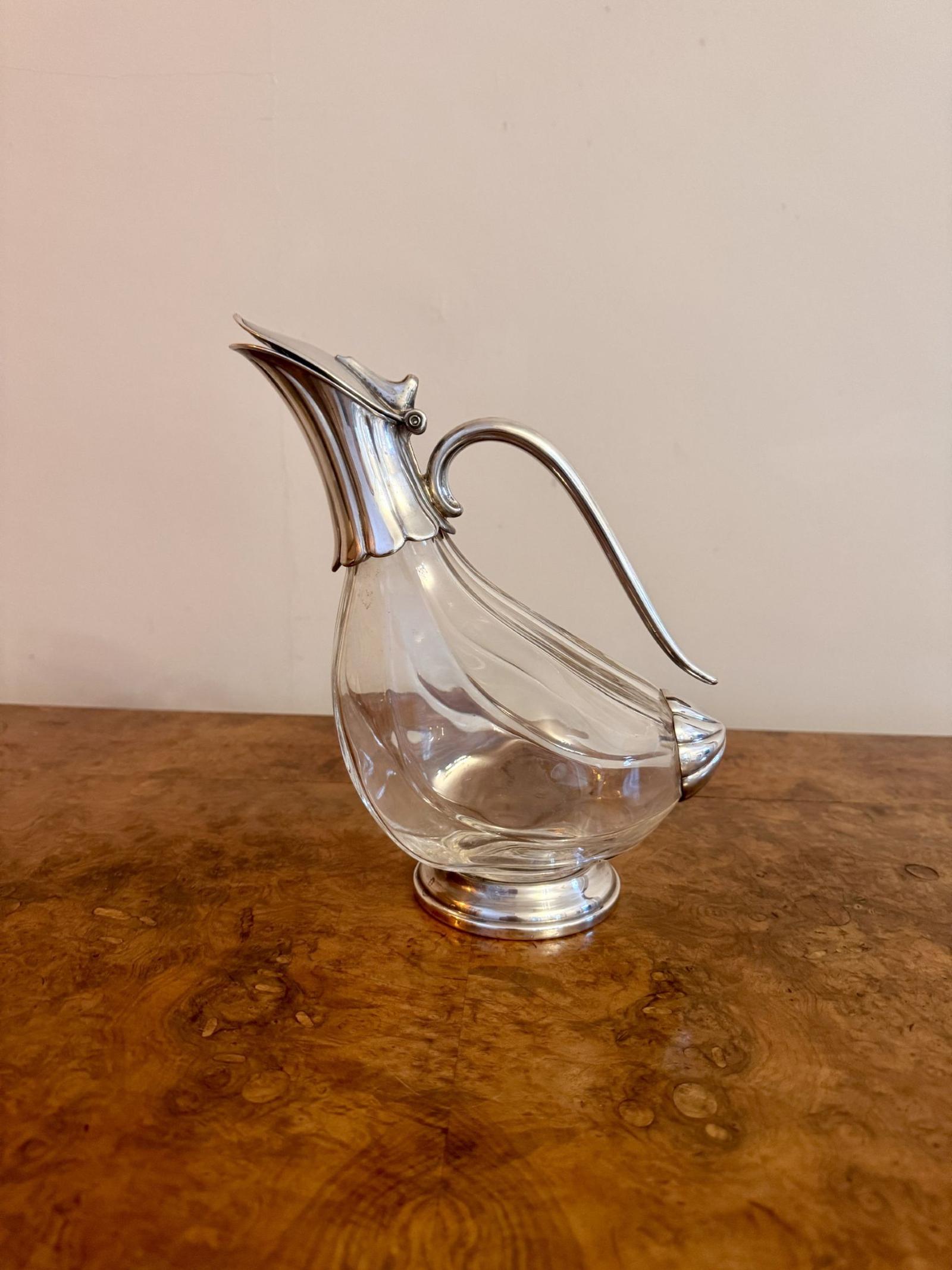 Stunning quality antique claret jug, having a quality antique claret jug in the form of a bird with silver plated mounts and glass body with a shaped spout and handle raised on a circular shaped base.