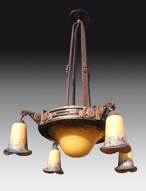 Stunning Quality Art Nouveau Muller Freres Pate Verre & Wrought Iron Hanging Chandelier Light