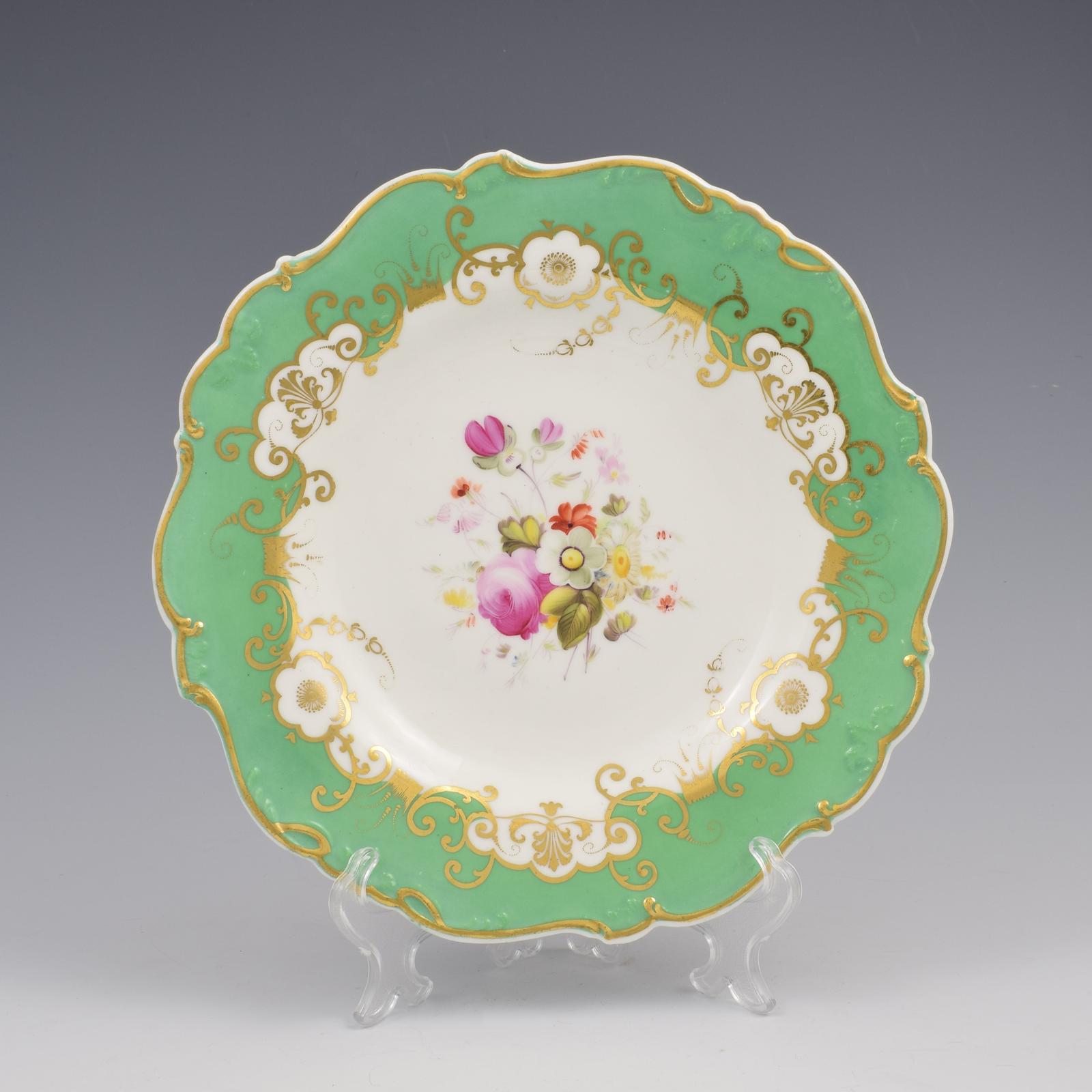 A very pretty early 19th century porcelain dessert plate by Minton, with irregular shaped rim with relief moulded detail. A lovely fresh apple green enamel ground to the edge, reserving the centre, with a delicate gilt border, forming anemone flowers, stylised acanthus leaves, trailing floral garlands and a myriad of scrolls and graduated dotted curls. The centre is superbly painted a large spray of Spring flowers in bright pastel enamels. Finished with a gilt rim. Marked to the reverse with pattern number 1732 in gilt, c.1825-1830.