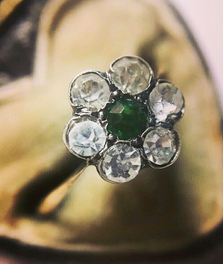 Stunning Unusual Antique Emerald & White Stones Dress Ring Yellow Gold