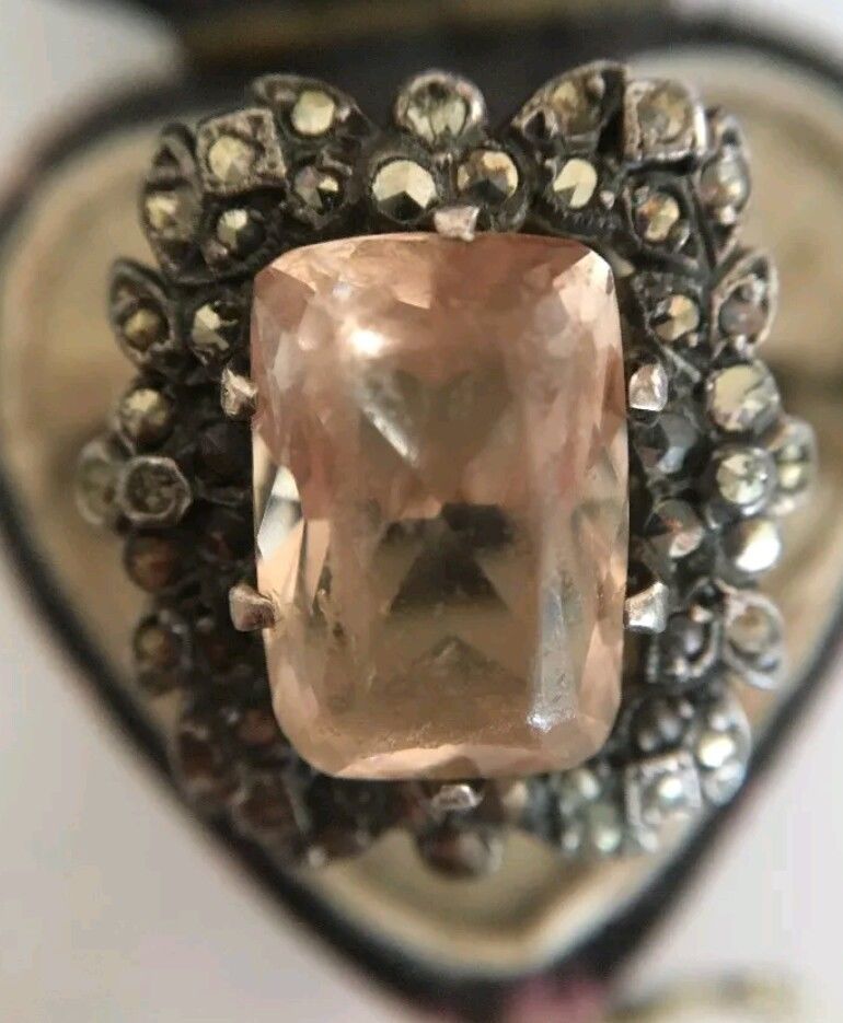 Stunning Unusual Art Deco Morganite & Marcasite Yellow Gold Dress Ring